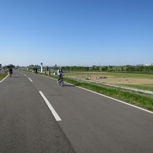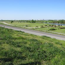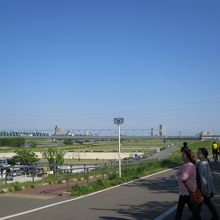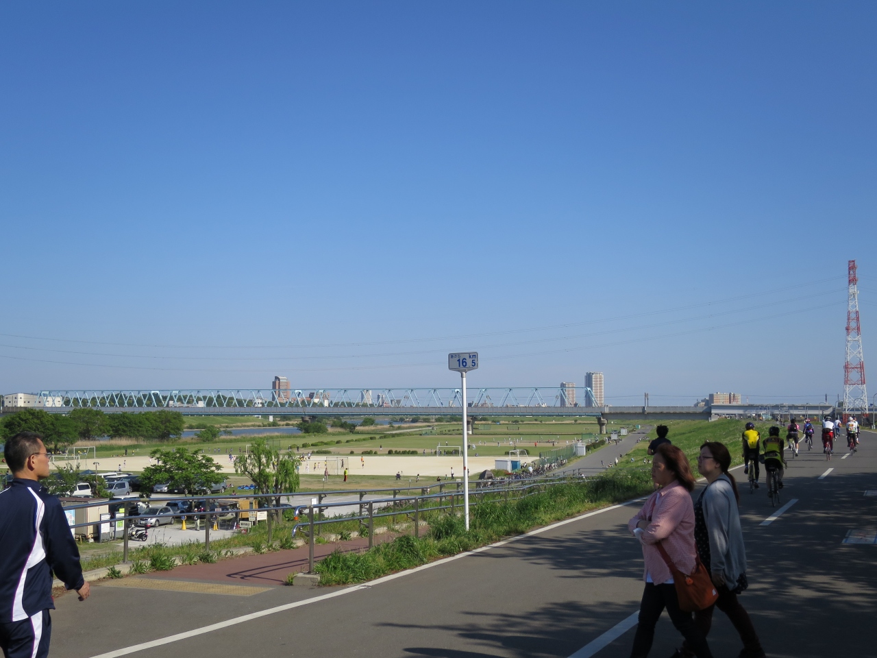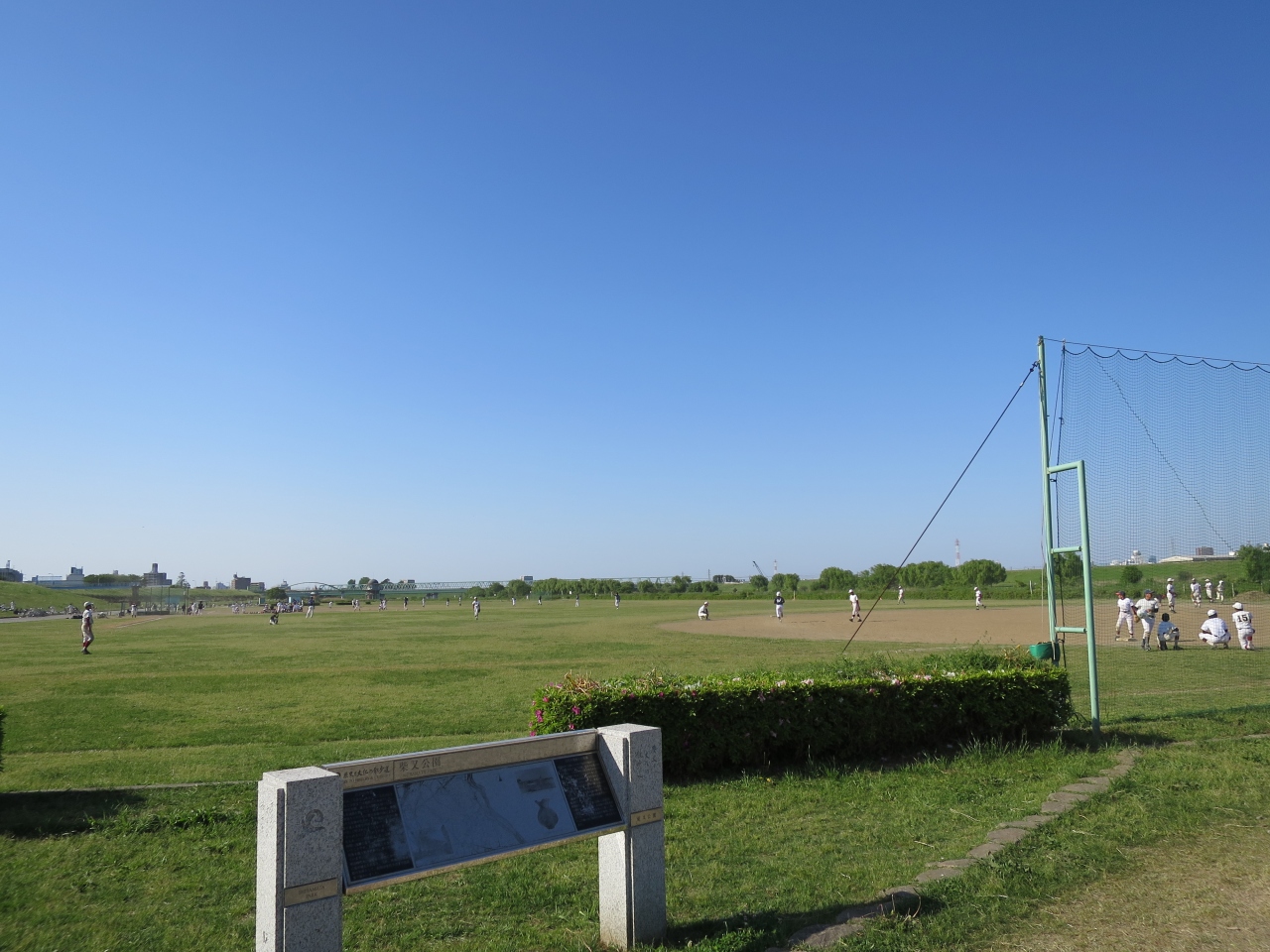 柴又駅から帝釈天参道を通って帝釈天を参拝し、山本邸を見学した後、柴又公園から江戸川堤に行きました。堤から見られる景色はどことなく懐かしい風景で、野球場で草野球している人や、犬と遊んでいる人、凧上げする人などが見られます。