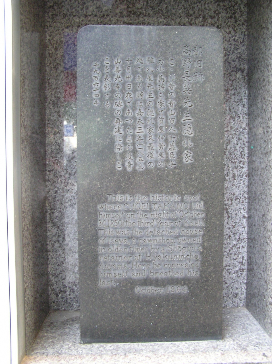 高野長英は1849年江戸に戻り、与力小島助次郎の持ち家で質屋伊勢屋の離れに暮らし、沢三伯の偽名で医業に従事したが、翌年町奉行所に踏み込まれて捕縛された。幕府の公式記録では、長英が自ら喉を突いて自害したと記されているが、捕手役人の記録によると、激しく抵抗したため十手で何度も殴打され、縄をかけられたときはすでに半死半生となり、護送中に絶命したと記されている。