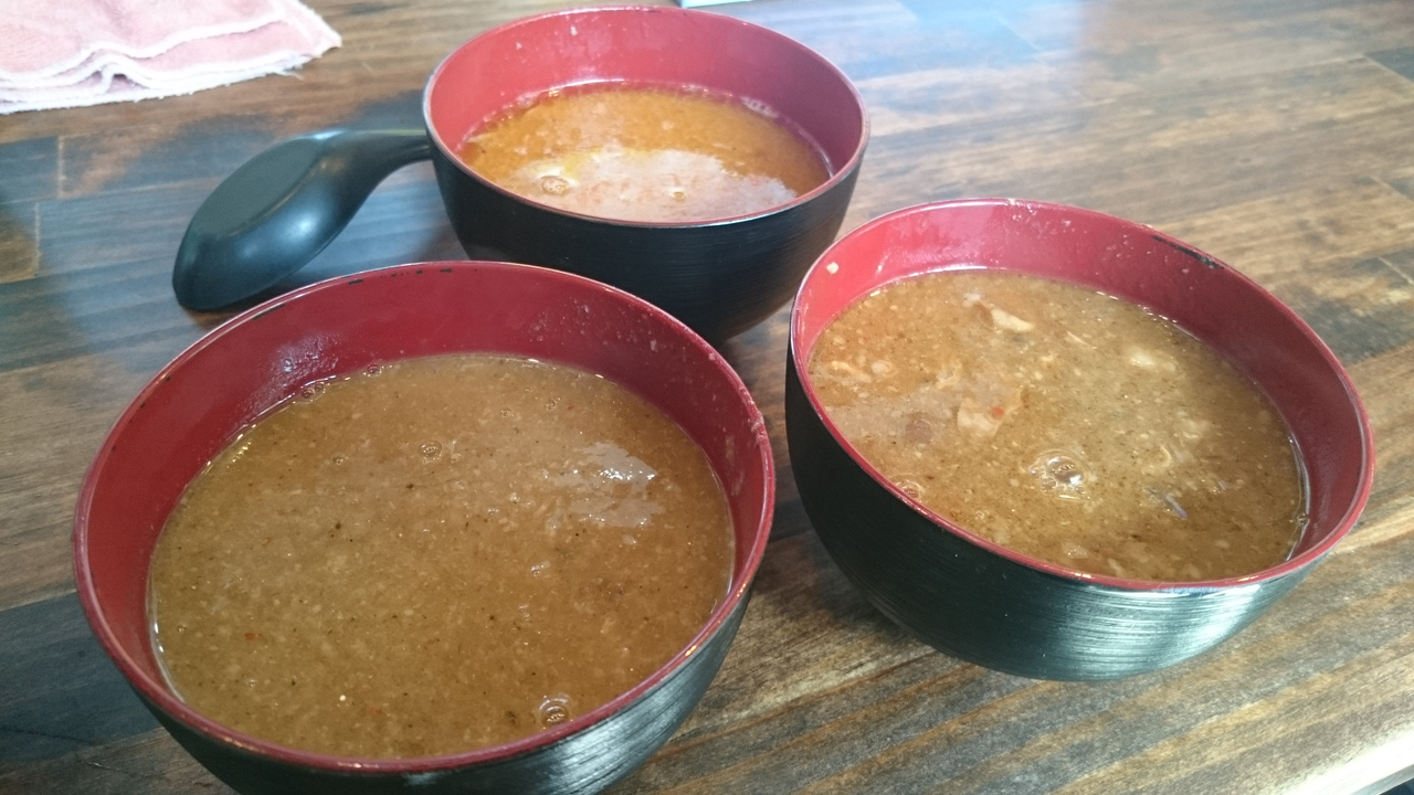 西武池袋線東長崎駅から徒歩数分のところにあり、都営大江戸線落合南長崎駅からも徒歩可能な場所。お店の前にはミストがあって涼しい。オリオン食堂というので沖縄かと一瞬思うがそうではなく、東長崎では、老舗のラーメン店。店内はラップが流れていたり閉め何となく南国。毎年の限定メニューがあるようで、今年はアサリそばでした。もやしと辛ニラが食べ放題で、もやしは特性の醤油で食べるとおいしく、ニラも辛すぎなく、ビールのアテにあいそう。ラーメンのスープは魚介系の出汁。三色つけ麺のつけ汁は毎日変わるようですが、今回は濃魚醤油味、エビ塩味、もつ味噌味。お椀3つ渡されルセルフサービス。濃魚醤油味は、ノーマルな魚介系濃厚スープで甘味があって美味しい。一番麺に絡んだ。エビ塩味はスープを開けたとたん海老の臭いがプンプンするタイプで少し塩辛い。もつ味噌味は、まさに単品メニューにあるもつ煮込みをスープで割った感じ。麺は中太麺のモチモチタイプ。海苔、半熟卵半分、大きめのシナチク、乾燥海老がのっている。麺の量はつけ麺の場合、200グラム、300グラム、400グラム同額で、お腹いっぱい。常に新しいものを研究しているチャレンジングなお店という印象。