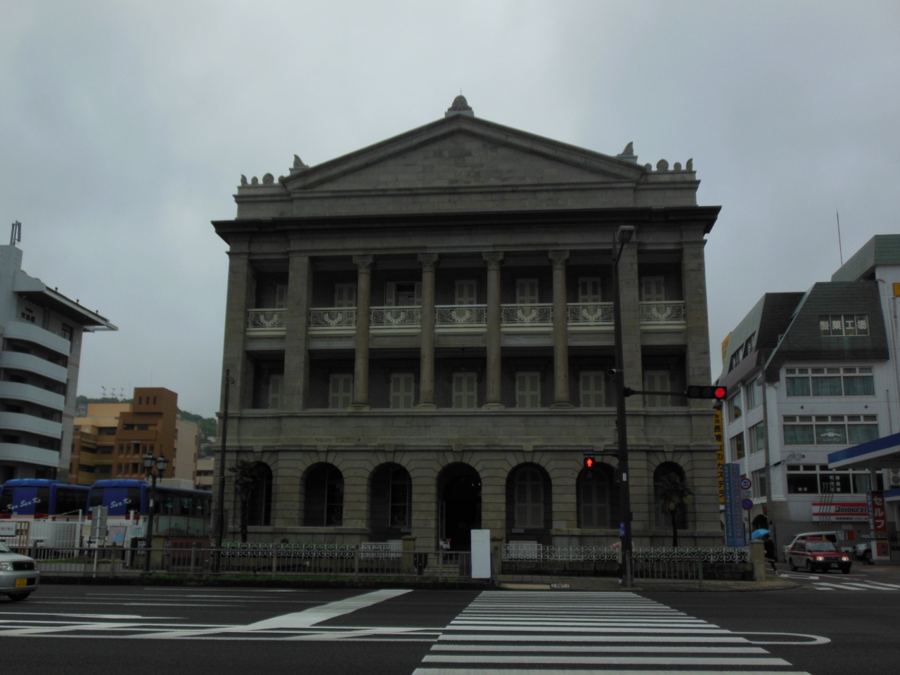 市電だと大浦海岸通り、バス停はグラバー園下、ちゃんぽんで有名な四海楼のすぐ近くにあります。海を向いて立っていますが、とても大きく、石造りの目を引く建物です。