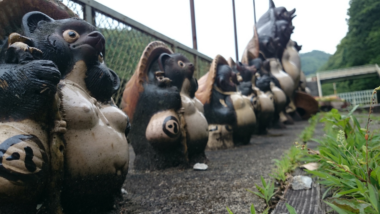 ホームに立つと、よく店先に置いてあるたぬきの置物がたくさん並んでいました。トロッコの乗車待ちでしょうか。背の順に並んでいて癒されます。