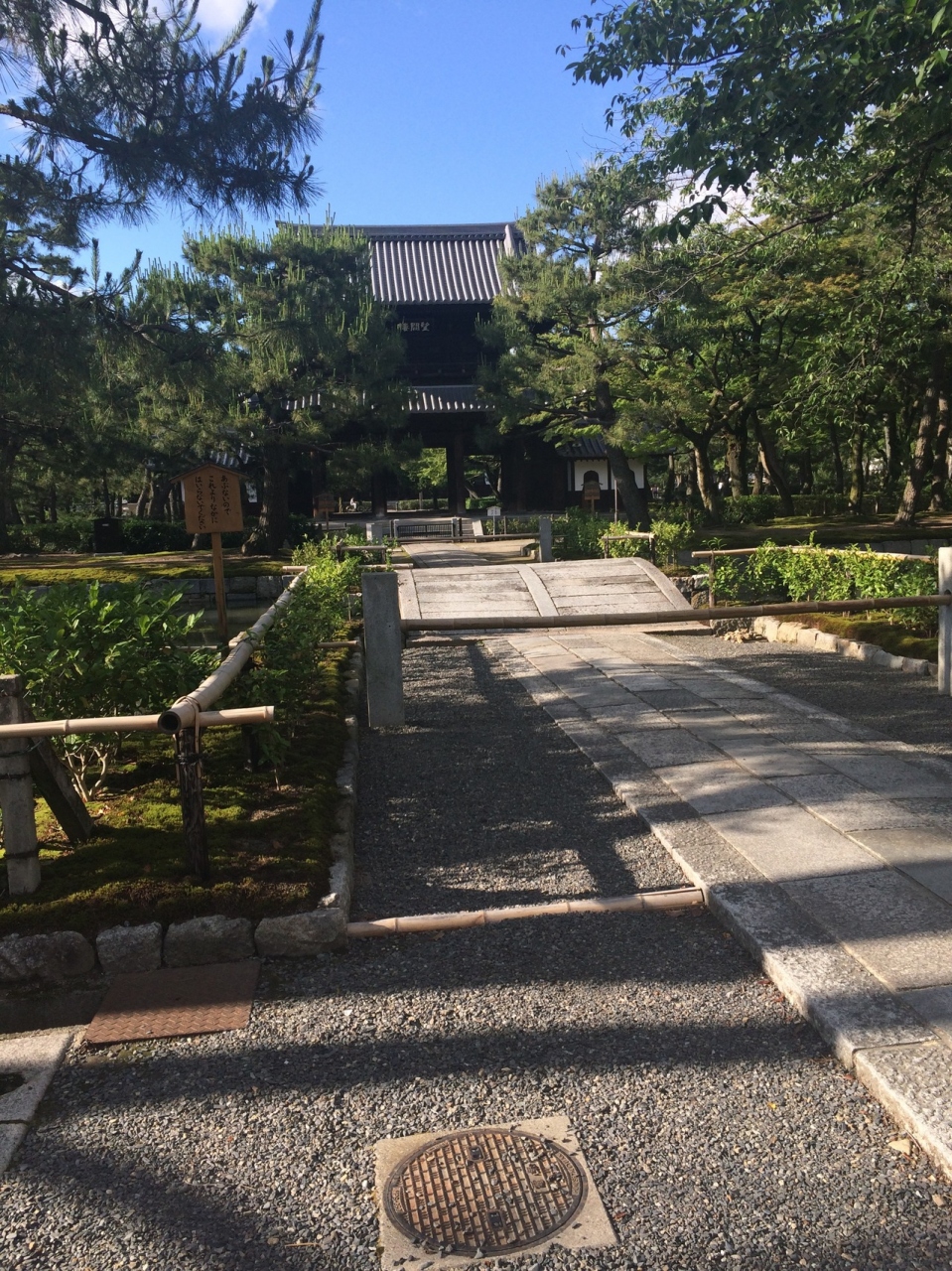 市バスで清水を少し過ぎた東山安井あたりでおりました。敷地が広く静かなお寺です。茶色の木造の大きな建築が、緑に映え散歩するのにも落ち着く場所でした。祇園のそばにあり、花見小路にも通じています。石庭も綺麗なお寺でした。比較的繁華街のようなところの近くにありますが、建仁寺は少し人混みから離れてゆったりできる場所でした。
