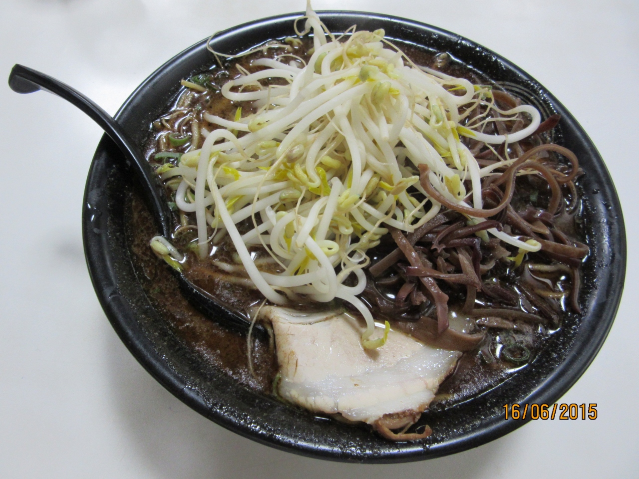 がっつりラーメンを食べたい人向けの店。黒スープ、具はたっぷりのもやし・きくらげ・