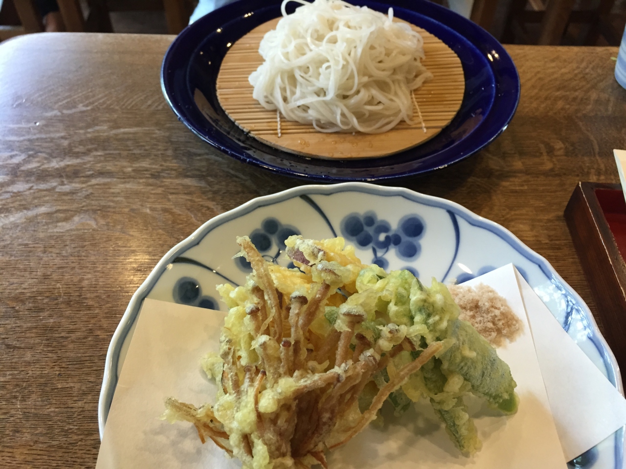 天ぷらはカリッとあがっていて美味しかったです。二人で一人前あれば十分かと。。。目当ての臼引き蕎麦は既に売り切れでしたので更科を注文。やや固めですが口にいれたとたんふわっと良い香りが。。