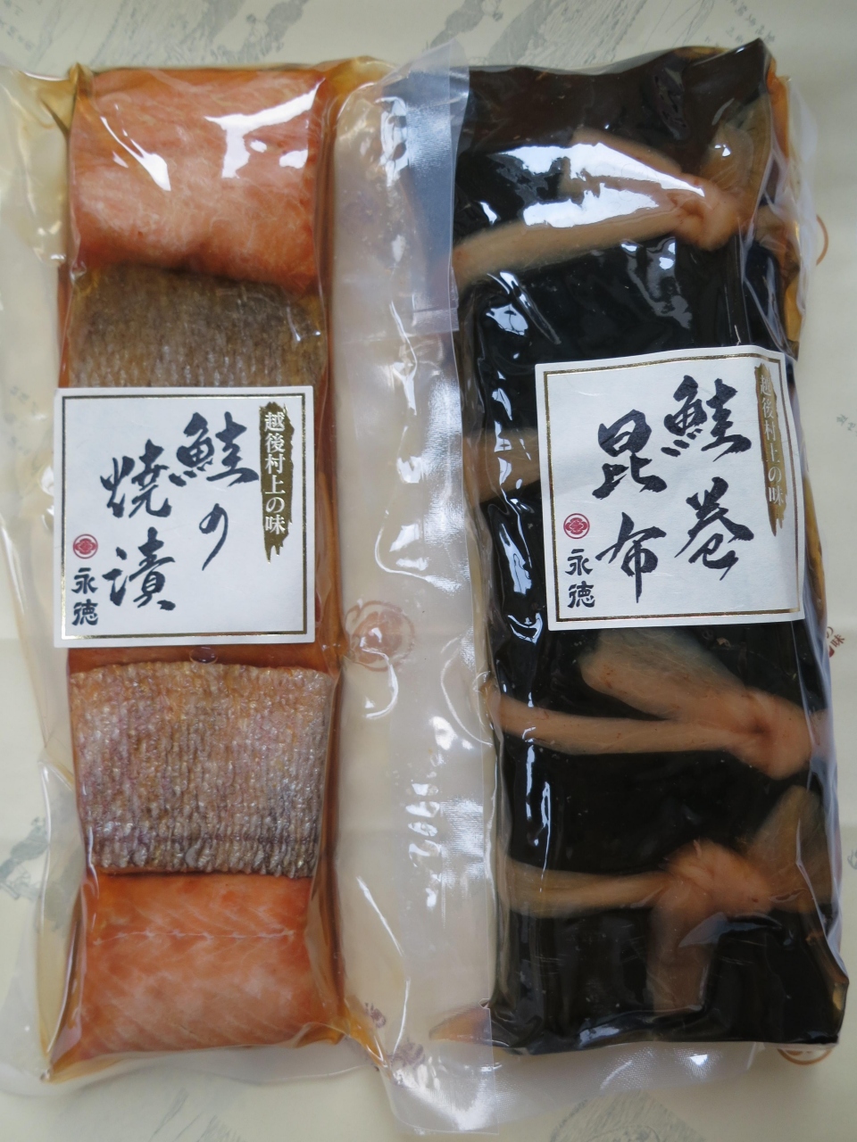 村上市にある鮭製品加工販売会社の直売店です。古来より越後村上は「鮭の町」として知られ、三面川で世界で初めて鮭の増殖事業に着手し、鮭文化がさらに発展、数多くの鮭料理が出来たようです。店内には沢山の鮭製品が並んでいました。その中より、朝食にも良さそうな「鮭の焼漬」と「鮭巻昆布」を購入してみました。家族でいただきましたが、「鮭の焼漬」はみんなに大好評。子どもたちもよく食べました。「鮭巻昆布」は、昆布が好きな人には好評でした。温めただけで食べられ、賞味期限も長いので、お土産や贈り物にもおススメです。