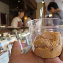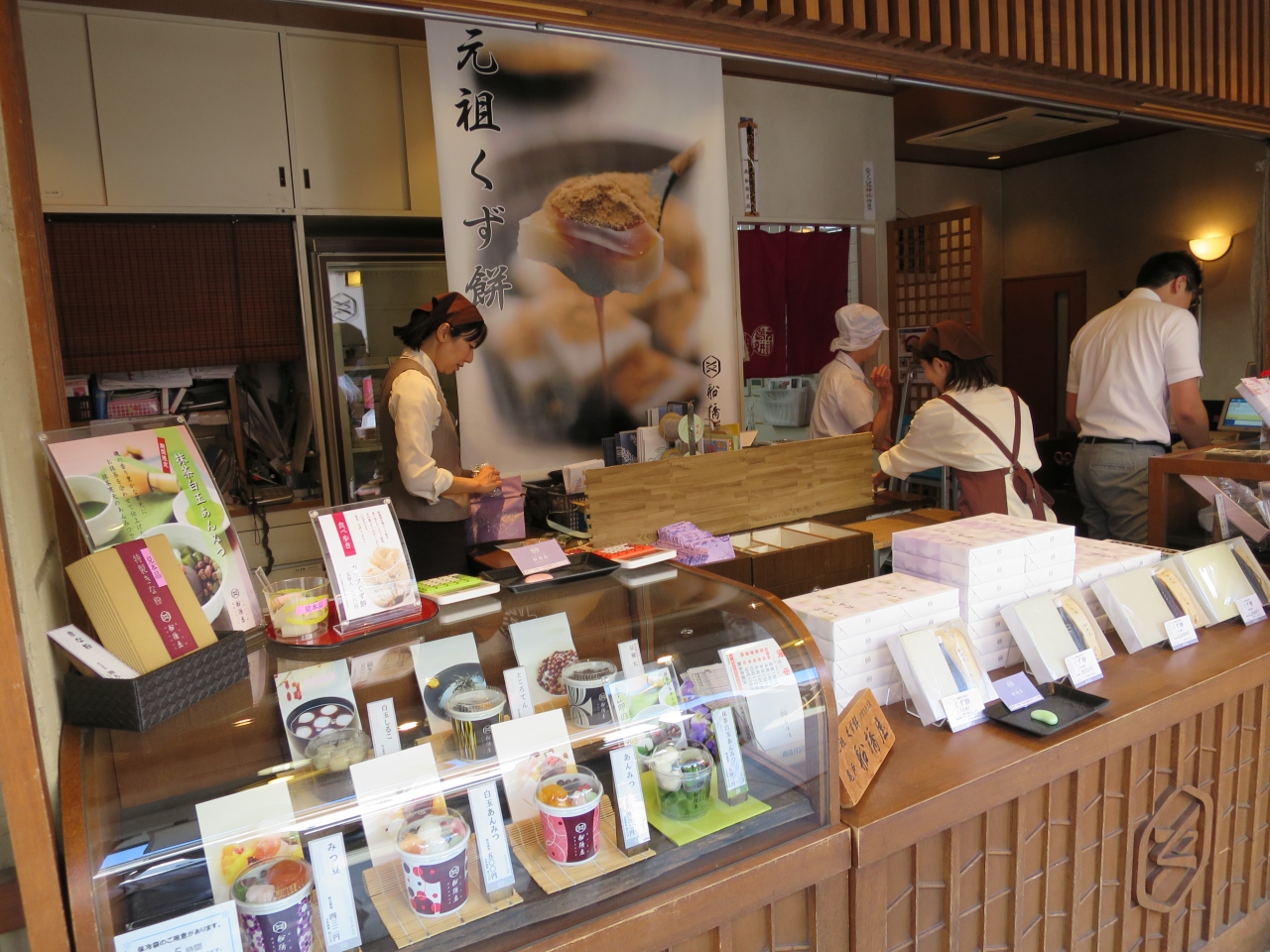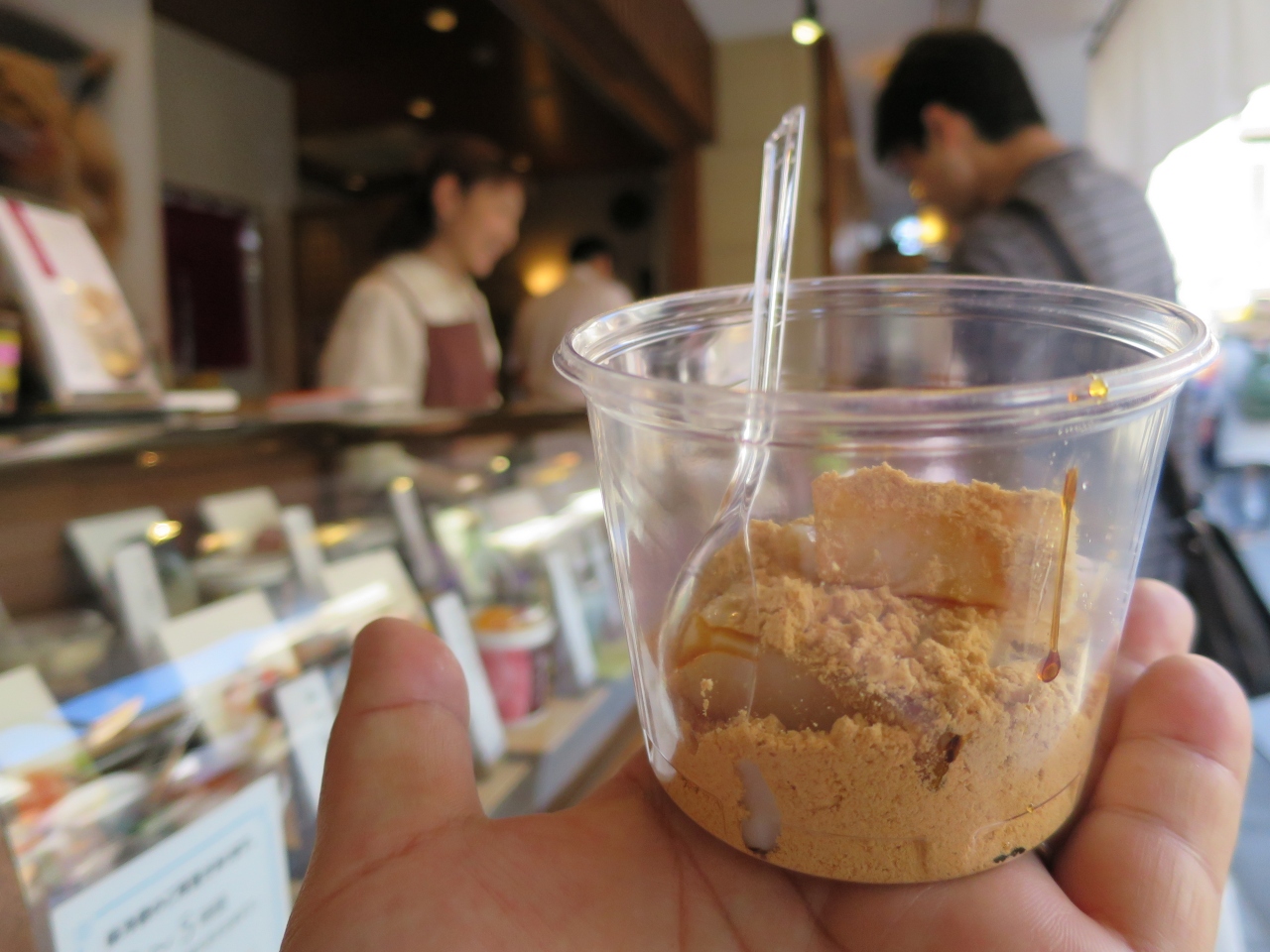 柴又駅から帝釈天参道を進み、柴又街道を渡った角に亀戸天神のくずもちで有名な船橋屋があります。帝釈天参道では餡子のついた草餅ばかりですが、草餅に飽きたらここのくずもちがお奨めです。カップに入ったワンカップくずもちが店頭で食べられます。カップに入っているので、食べ歩きも出来ます。出来立てのぷるるんとしたくずもちは一味違います。