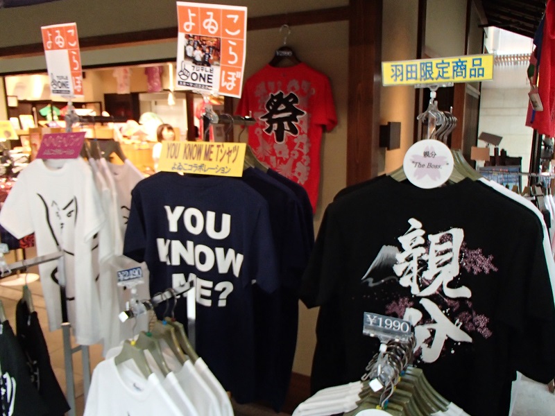 羽田国際線ターミナルの江戸小路のお土産物屋さんですけど外人さんが喜びそうな面白いプリントのてぃしゃつがいっぱいで見ていて面白いですよ。値段は1990円のものが多いですね。よゐことのこらぼてぃしゃつというのもやってましたよ。