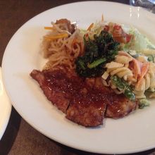 日替わりランチ650円を注文。プラス150円でドリンクがつきます。おろしポン酢のロースカツに、切り干し大根、マカロニサラダ、キャベツのサラダと付け合わせの野菜がボリュームがあります。