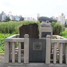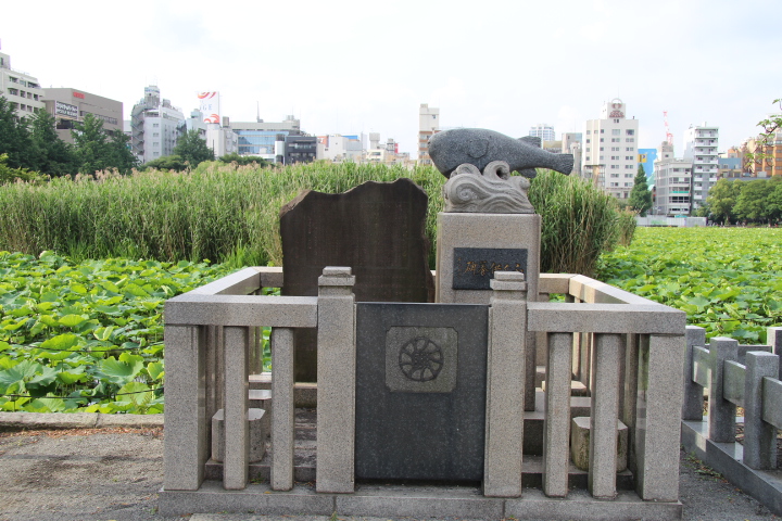 上野不忍池の弁天島にありました。弁天堂周辺にはユニークな碑がたくさんありますが、この碑もそのうちのひとつです。なかには何の碑だか分かりにくいものもありますが、この碑の上にはフグの石像が載っており一目で分かります。