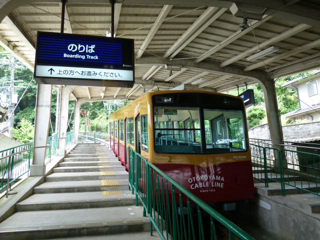 八幡にある石清水八幡宮に行くには京阪電車がべ便利です。八幡市駅前より男山の山頂への、この「男山ケーブル」も京阪電車が運営しています。山頂へは石段の坂道の参道を登って行く方法もありますが、だんぜんこのケーブルが楽ちんです。片道200円です。時期外れなのですいていましたが、紅葉の時期や年末年始は多くの人で賑わうことでしょう。山上駅へは数分、展望台からは木津川、宇治川、桂川が合流する河川が景観良く観れます。八幡宮やエジソン記念碑など見どころ豊富、さぁー男山を堪能しましょう。帰路は参道を下るのもいいですよ。