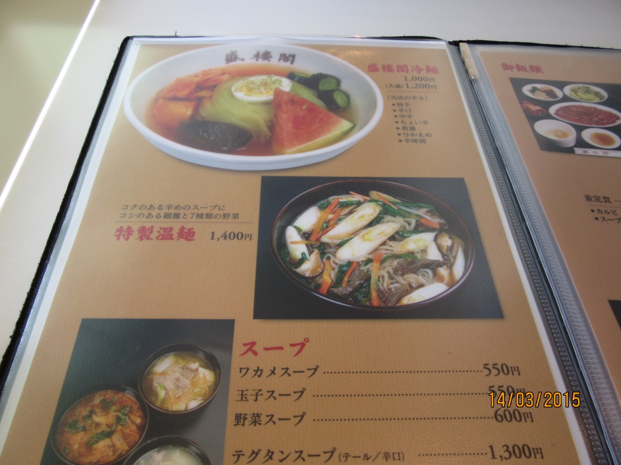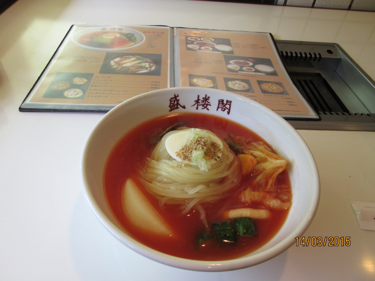 ランチで盛岡3大麺の一つ【盛岡冷麺】をいただいた。店は盛岡駅から徒歩約3分、ビルの2階。店は実に広く4人掛けテーブル、焼肉用テーブル、座敷もあり収容人数が多いので多少並んでも待たずに入れそうな感じであった。