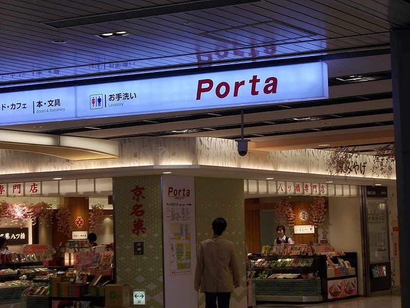 ポルタはJR京都駅前の地下にあるお土産屋さん街ですね。京都名物が何でも手に入りますよ。八つ橋はもちろん阿闍梨餅も売ってるんですが、ただ、在庫切れが多いんで手に入らないことが多いです。これだけは清水坂で買っておいたほうがいいですね。一般的な京都名物ならここで大丈夫ですよ。