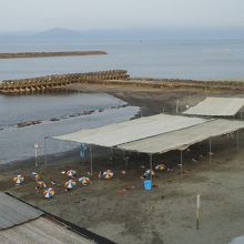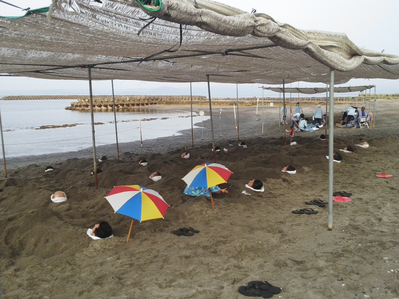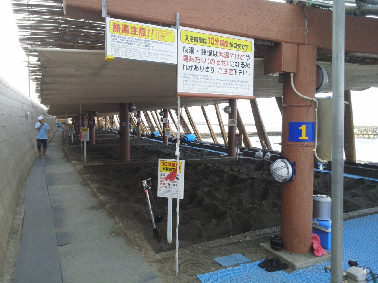 父の日と言うことでいつも良く旅行をする友達夫婦と一泊旅行で指宿温泉花の温泉「吟松」にきました。ちょっと時間があったので私一人でホテルから歩いてすぐの所にある砂むし温泉「砂楽」に写真を撮りにきました。波打ち際の砂むしには何人か砂に埋もれていました。私は温泉に入るのは嫌いなので体験はしていません。ホテルの温泉でも入っても身体を洗ったら湯船に浸かったらすぐ上がっています。5分以内でしょうね!