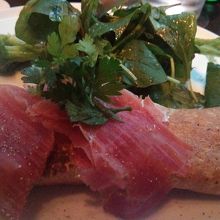 タルトフランベは、上に生ハムが載っていて、それぞれフランス産とスペイン産にしてくれました。生ハムは、カウンターの向こうで切ってるところが見えて、スペインバルにいるかのようでした。