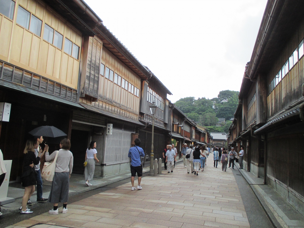 金沢駅から城下まち周遊バスで訪れた。バスの値段は200円で、一日券だと500円。降車時に支払いをする。バスはずっと乗っていれば、元の場所に戻って来るが右回りのバスだけでなく、左回りのルートもある。詳しくはパンフレットを確認するといい。15から20分間隔でバスが来るが、混雑時は乗れないことも。金沢駅から5番目の橘場町で下車をして、徒歩10分以内でひがし茶屋に到着。下車したところには交番と地図があるため、迷うことはないだろう。始めに観光案内所で一休憩をしてその後味噌と醤油屋で冷えた甘酒をラテと混ぜたドリンクを飲んだ。その後、ひがし茶屋へ。金箔のお店が多かった。印象に残っているのは箔座ひかり蔵。写真撮影は禁止だが、唯一できる黄金の蔵は見物。11年前に貼られた金箔が今も綺麗な状態で残っている。お土産に金箔入りのこんぺいとを購入。金沢は日本で1番の金箔の産地であることを感じることができた。ひがし茶屋周辺は1時間あれば回ることができる。