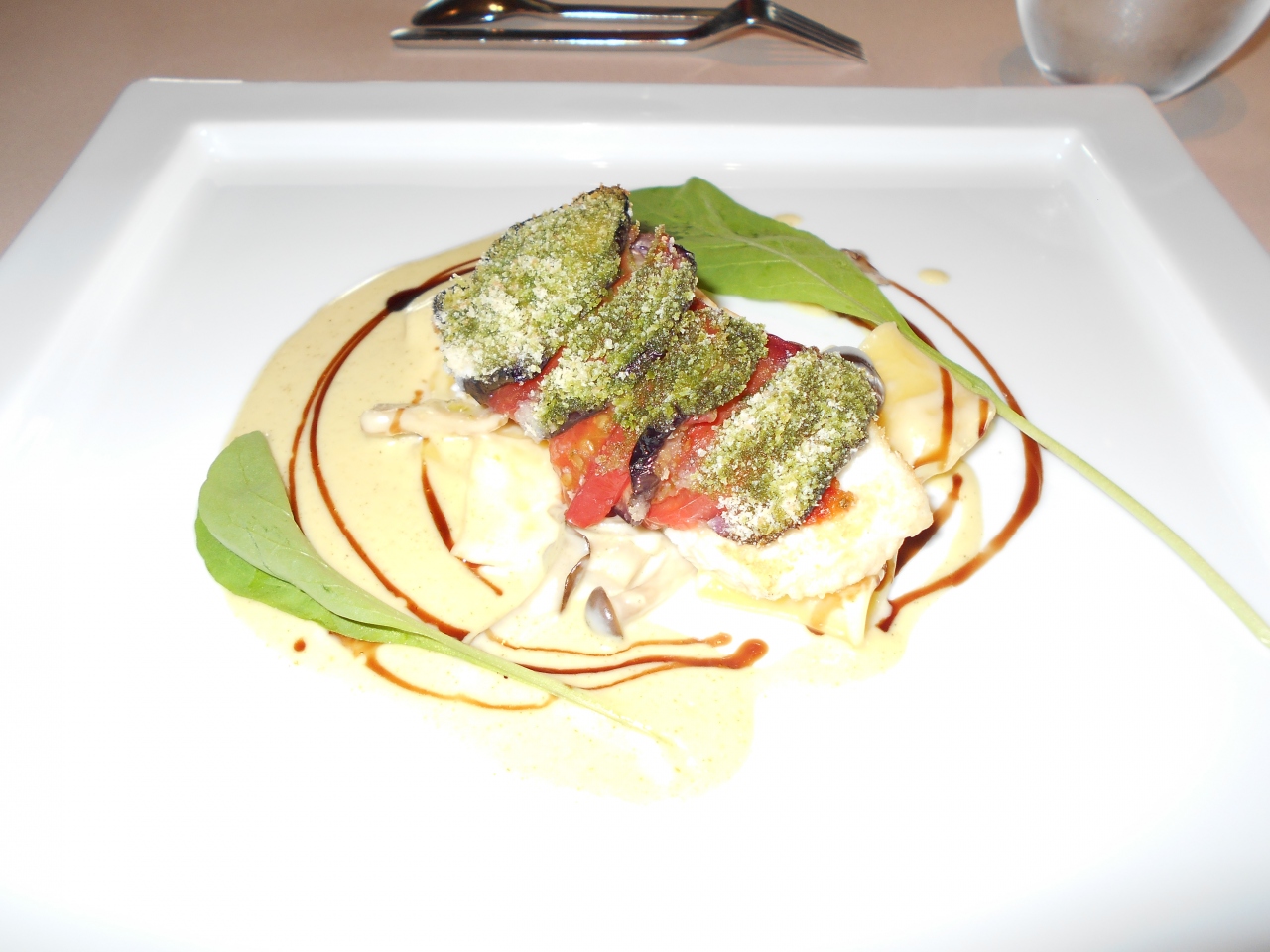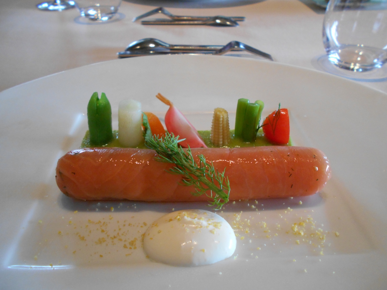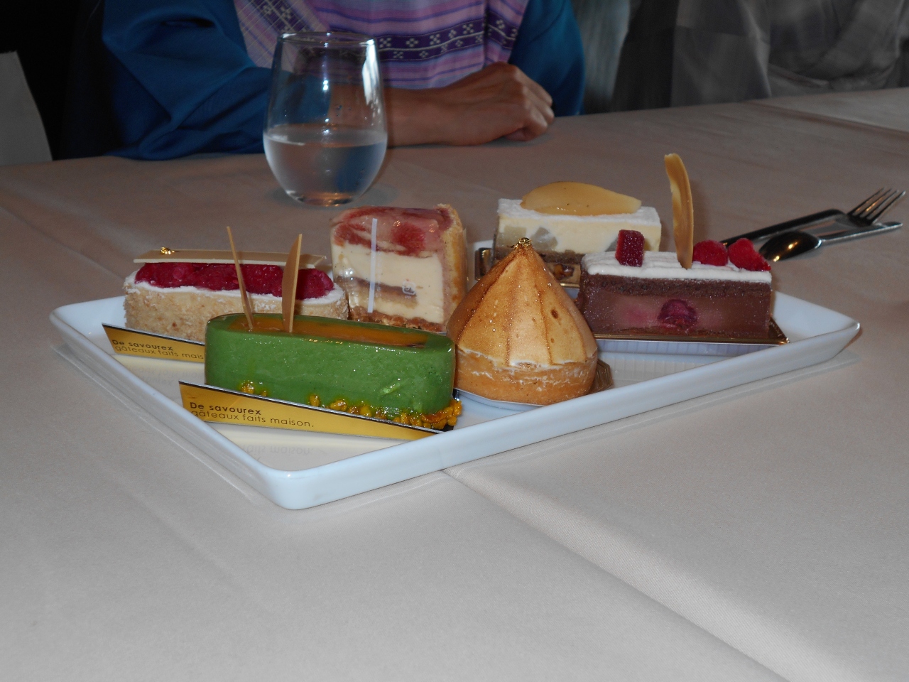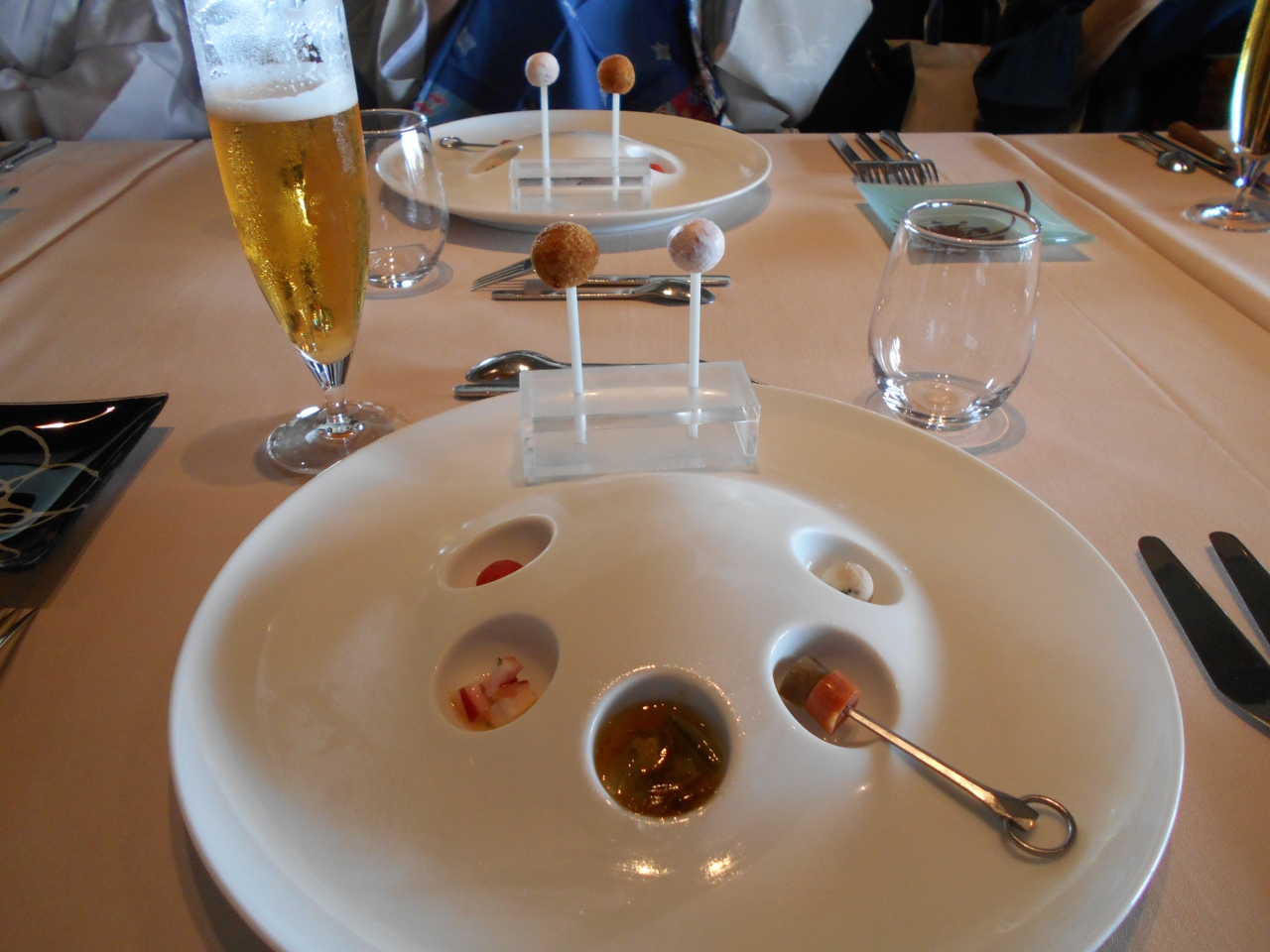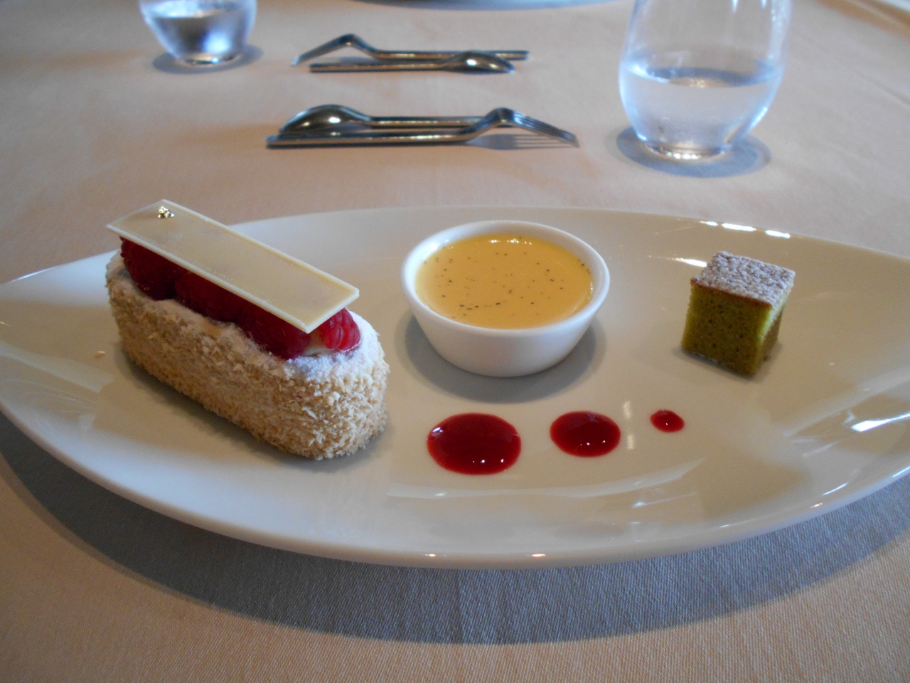 ランチの料理はアミューズメント、前菜、メイン(鴨肉かスズキのポワレ)デザート、コーヒー。