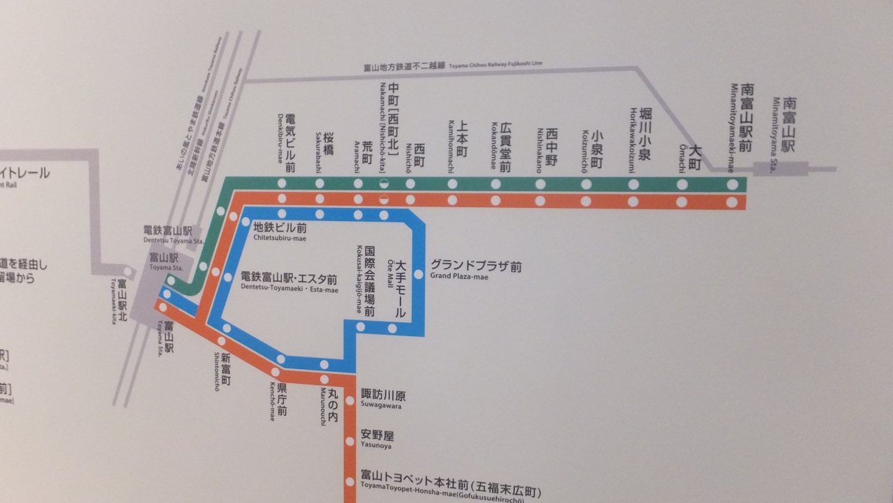 路線は、1系統:南富山駅前 - 富山駅、2系統:南富山駅前 - 電鉄富山駅・エスタ前 - *富山駅 - 新富町 - 大学前、3系統(環状線)の3路線あります。