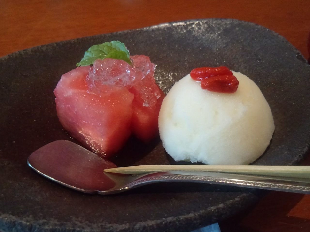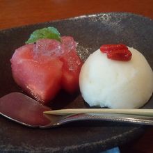メインがたこ焼きという感じで、後はタコのコースです。たこ飯もですが、まさかのデザートのシャーベットにまでタコが入っているとは思いませんでした。