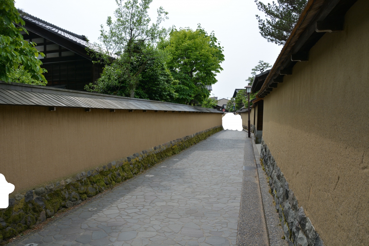 長町武家屋敷跡土塀は金沢の中心地から近くにあった。武士や忍者が出てきそうな、こんな景色になっているとは想像できない。観光客があちらこちらで記念撮影していた。冬には土塀を雪から守るためこもが掛けられるそうで、その頃にまた来てみたいものだ。