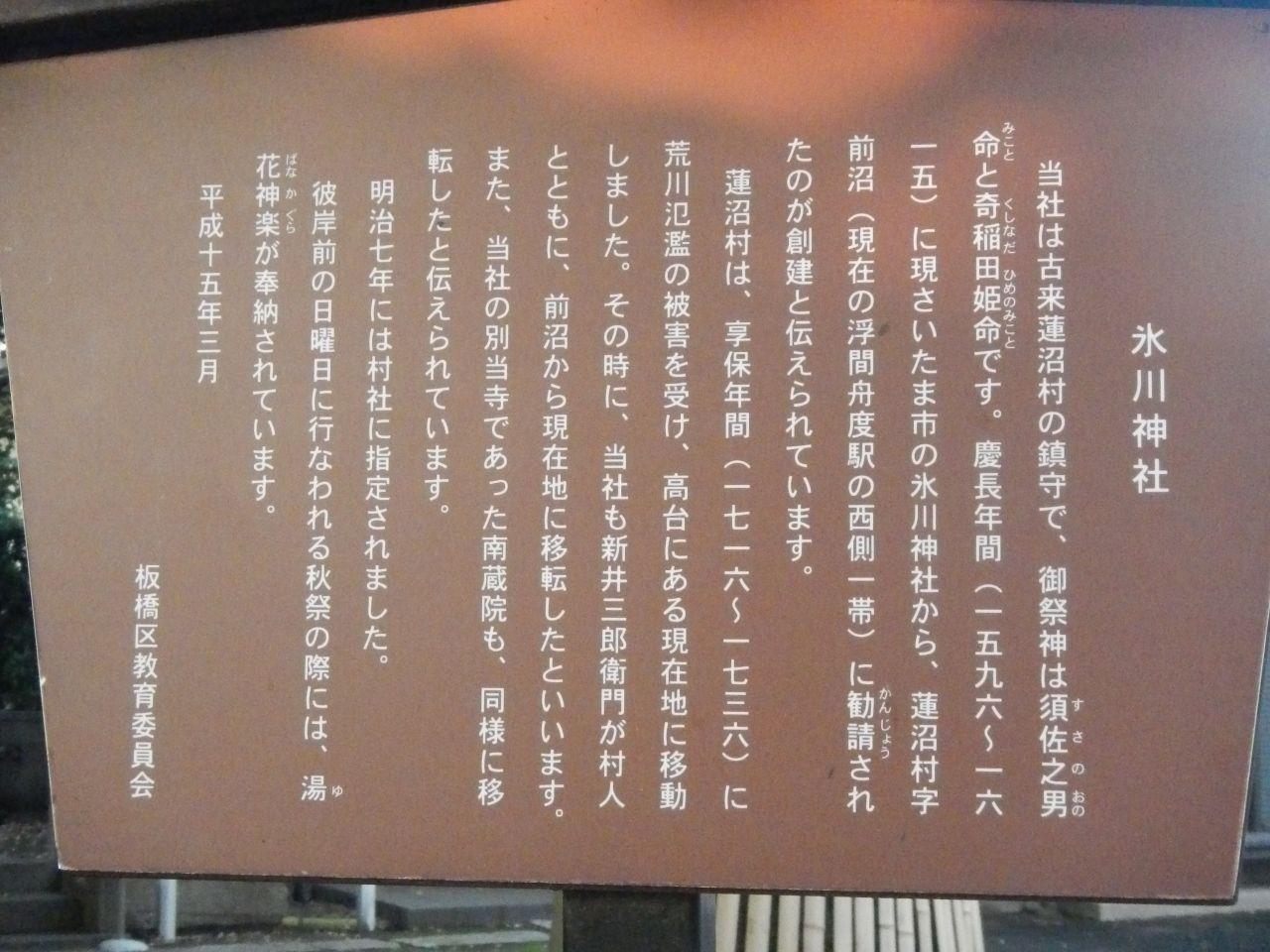 南蔵院の隣にある神社。板橋区には氷川神社が多い。大宮(さいたま市)の氷川神社から勧請されたのだろう。蓮沼村の鎮守。18世紀前半洪水に遭い、南蔵院とともに現在の地に移転してきたそうだ。境内に大木がその歴史を語っているようだ。