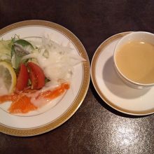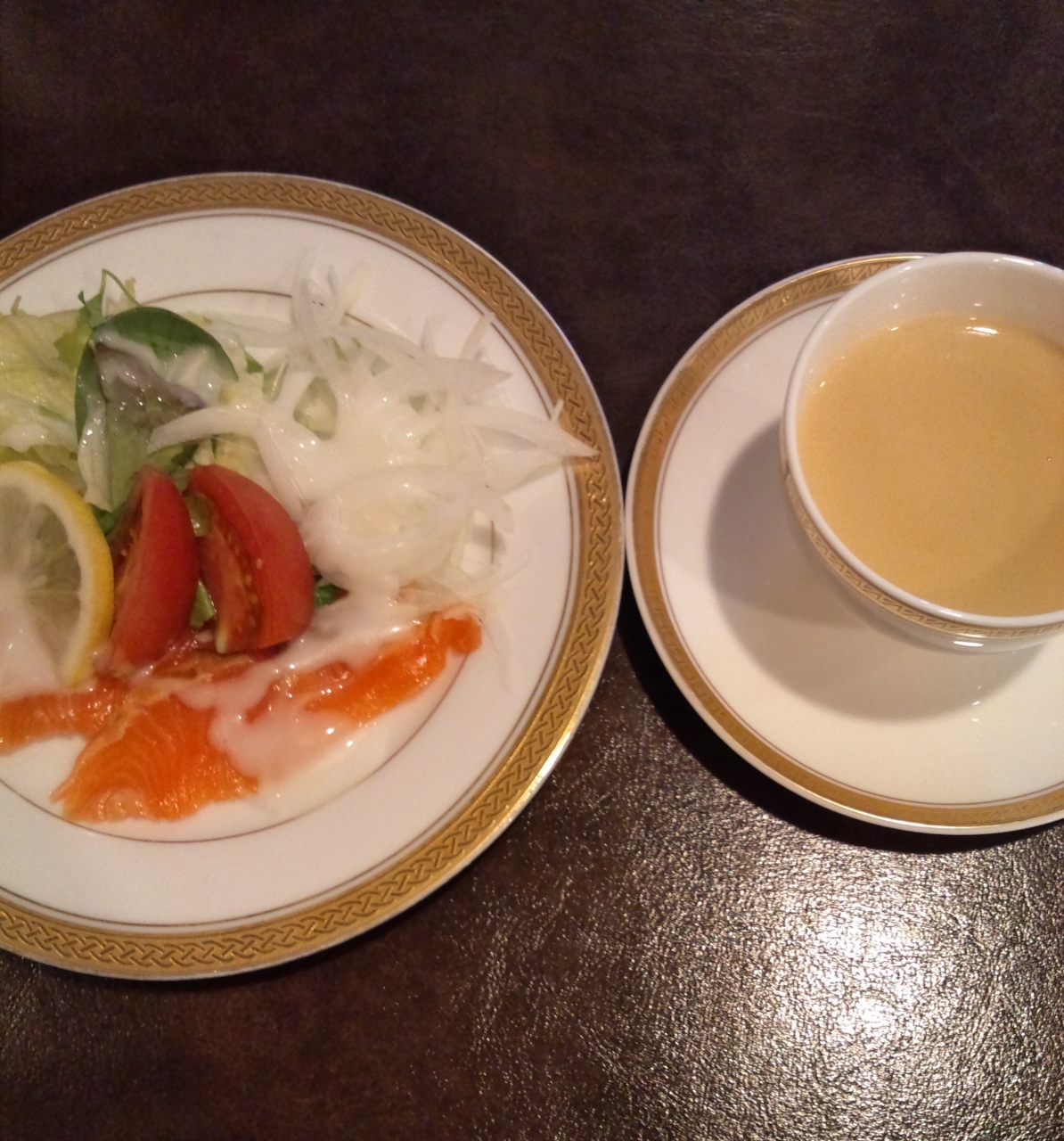 ランチに行きました。日替わりは和食と洋食から選べて810円です。今日は洋食メニューのゴーヤチャンプルーとサーモンのたたきサラダを注文しました。その他にご飯、ポタージュスープ、コーヒーも付きます。