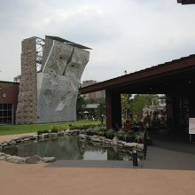 施設内のイメージは「ウッド」、各ショップは低層かつ小屋を連想させるデザイン、敷地の奥の方には巨大なクライミングウォールも設置されています。なんでも、国際競技に使える仕様だとか。