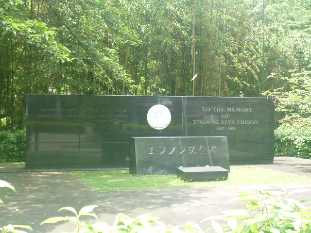 京阪八幡市駅より男山ケーブルカーに乗って、男山の頂上にある石清水八幡宮付近を散策しています。事前に調べたらこの「エジソン記念碑」があるとの事で早速足を運びました。場所は参道の西側のちょっとした広場にあります。でかいですね。一般的に記念碑の大きさは大小ありますが、どちらか言うと大きい方に入るのではないでしょうか。ここの竹を使い電球を発明したとされる、あの偉大な発明家エジソンの記念碑です。さぁー休憩しゆっくりと下山しますか。
