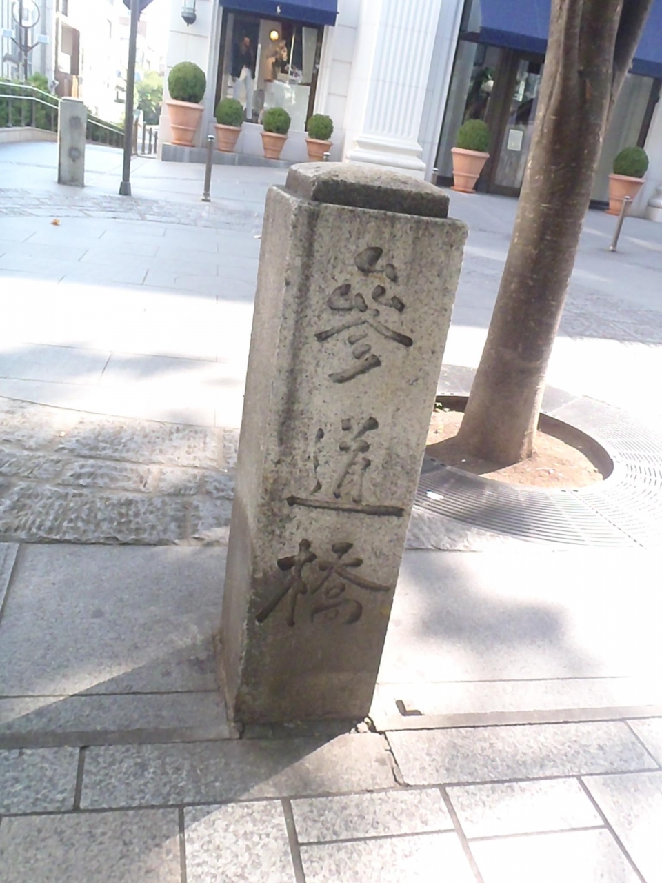 明治通りと青山通りの間、表参道からならキディーランドや表参道ヒルズの明治通り側、現在は川だった所に蓋をしてその上を遊歩道として利用しているのでなかなか分からないのですが、橋の基柱の石碑が残っていて当時川があった面影を残しています。