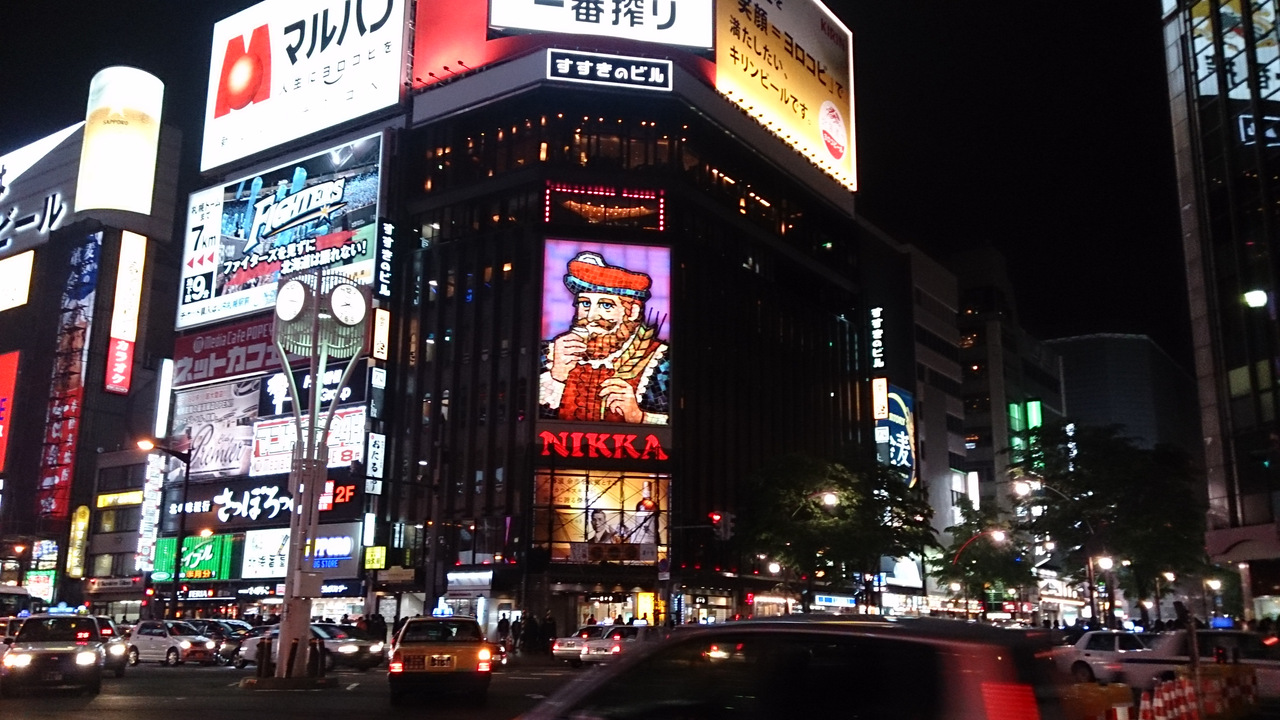 ちなみに交差点のビルにあるニッカウヰスキーのキングは昔からあるのでおなじみですが、現在までに何回か改装されており微妙に変わっているそうです。