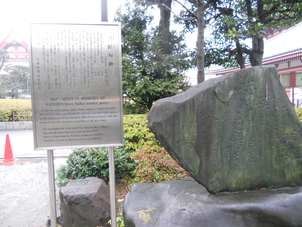 雷門から入って「浅草仲見世商店街」を進み、宝蔵門まできたら右に曲がった場所にひっそりと建っています。「西山宗因」「松尾芭蕉」「榎本其角」の江戸時代前期を代表する俳人三匠の句が刻まれている碑です。ガイドブックなどにはあまり紹介されていないので、見逃さないようにしましょう。