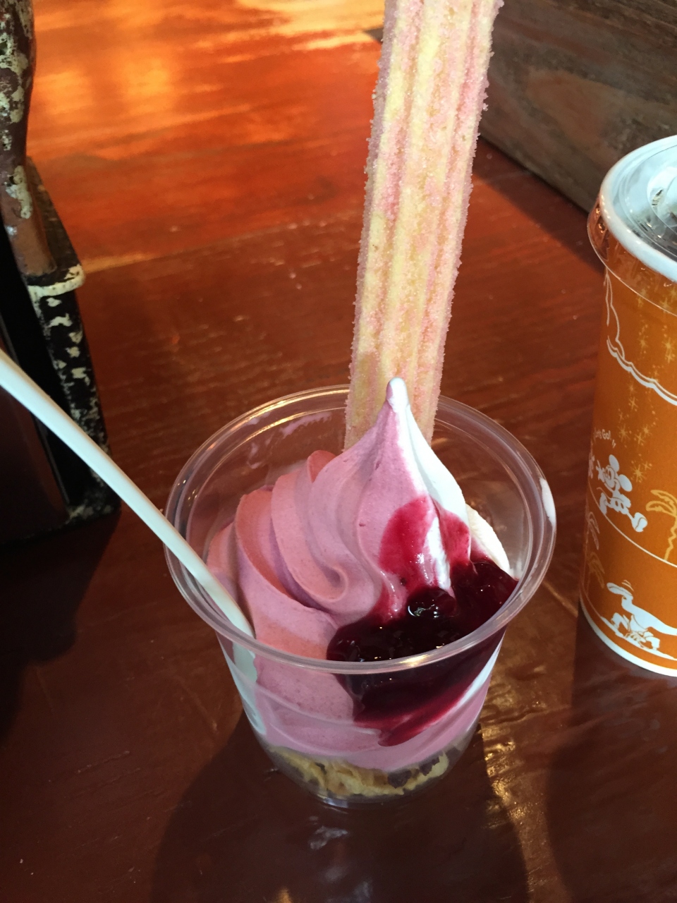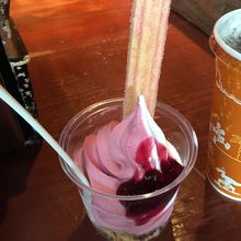 イースター仕様なのか?期間限定のフレーバーとのことで、ストロベリー味のチュロスにラズベリーとプレーンのMIXソフトの組み合わせでした。