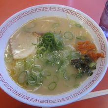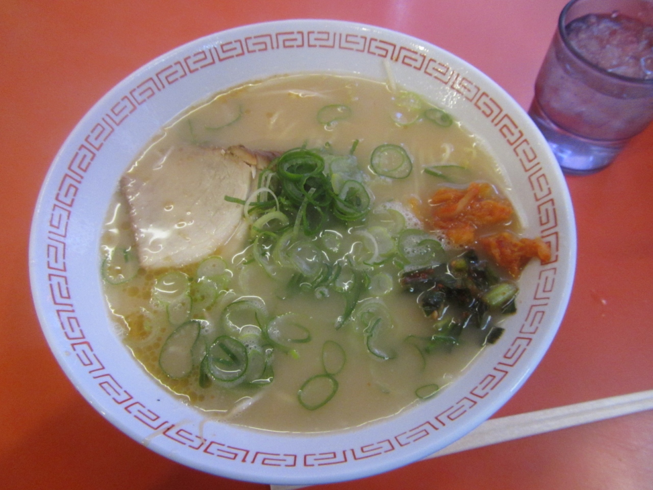 ラーメンはあっさり系のとんこつスープで、テーブルにどんぶりで置かれたキムチやニラ、ニンニクが入れ放題。