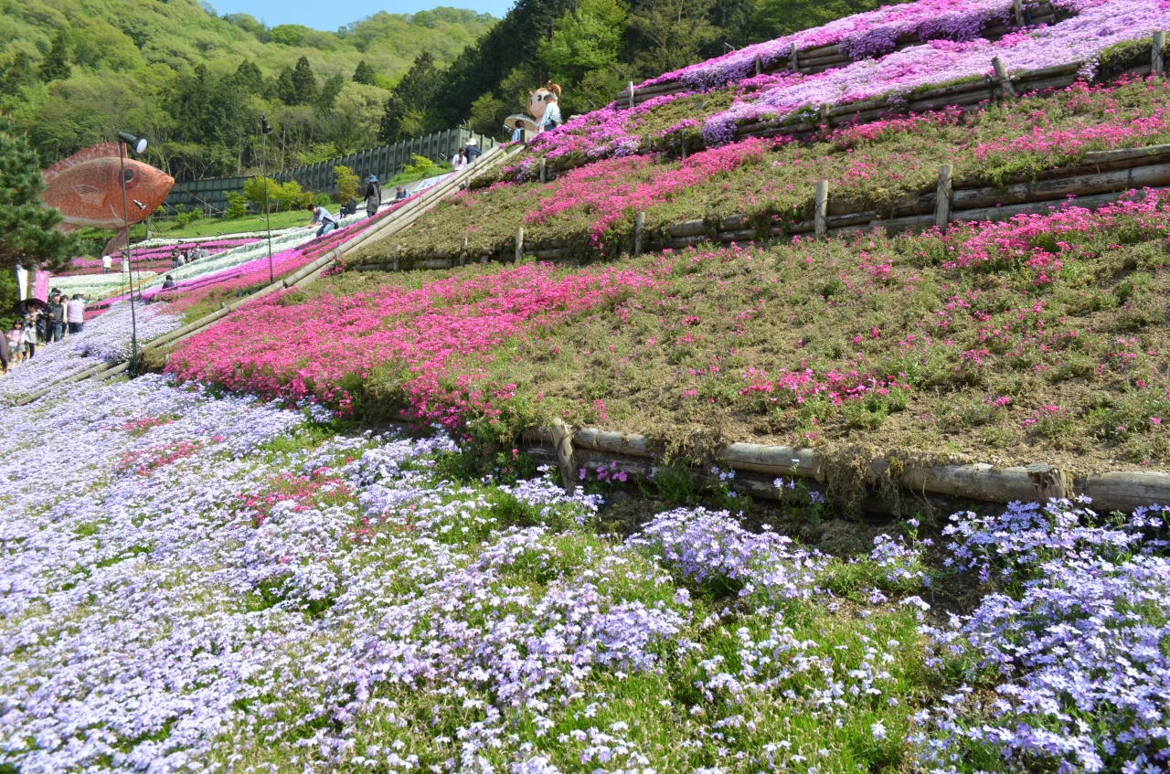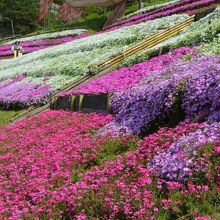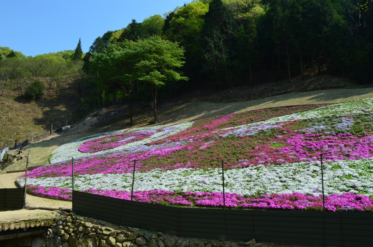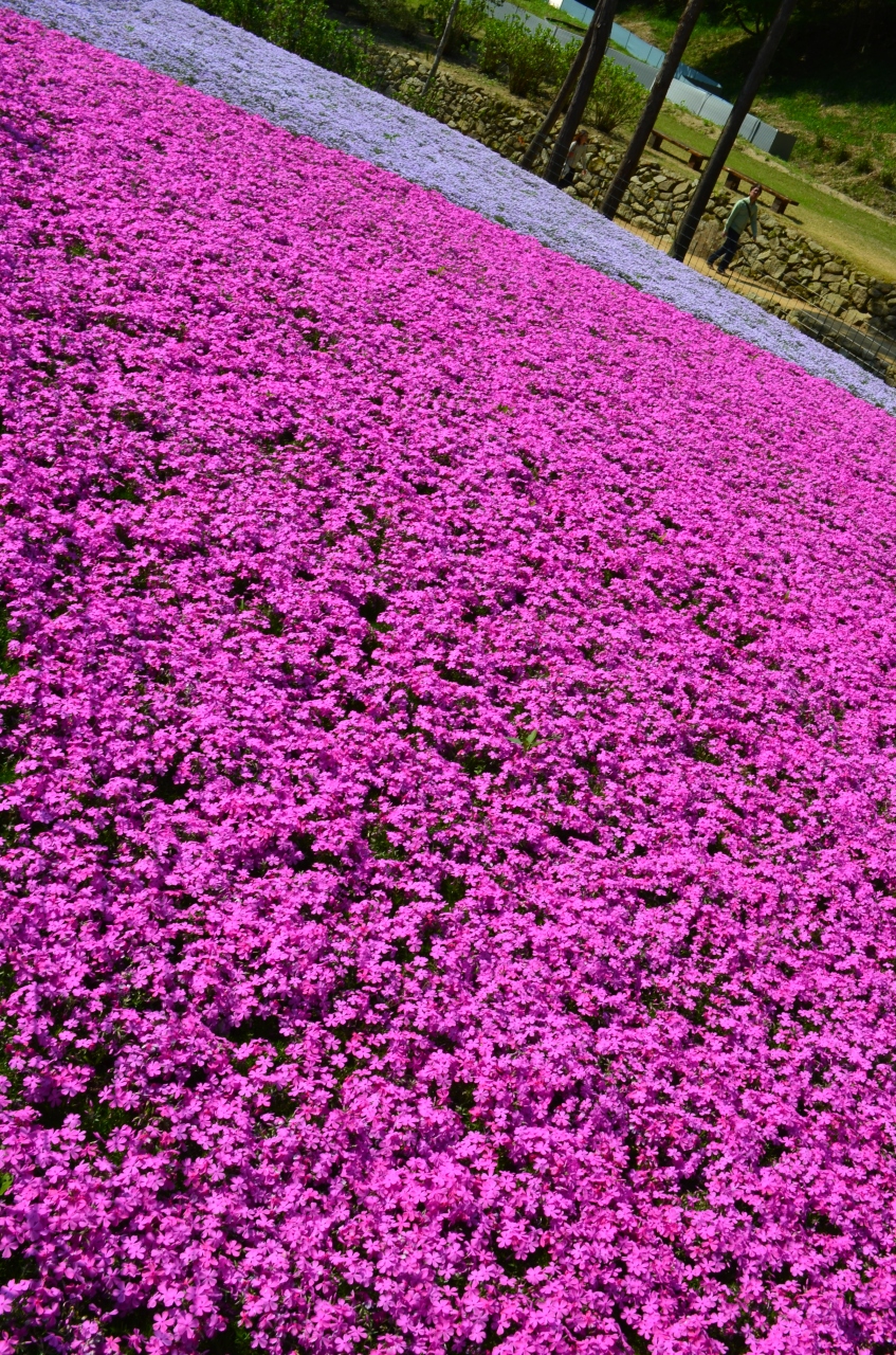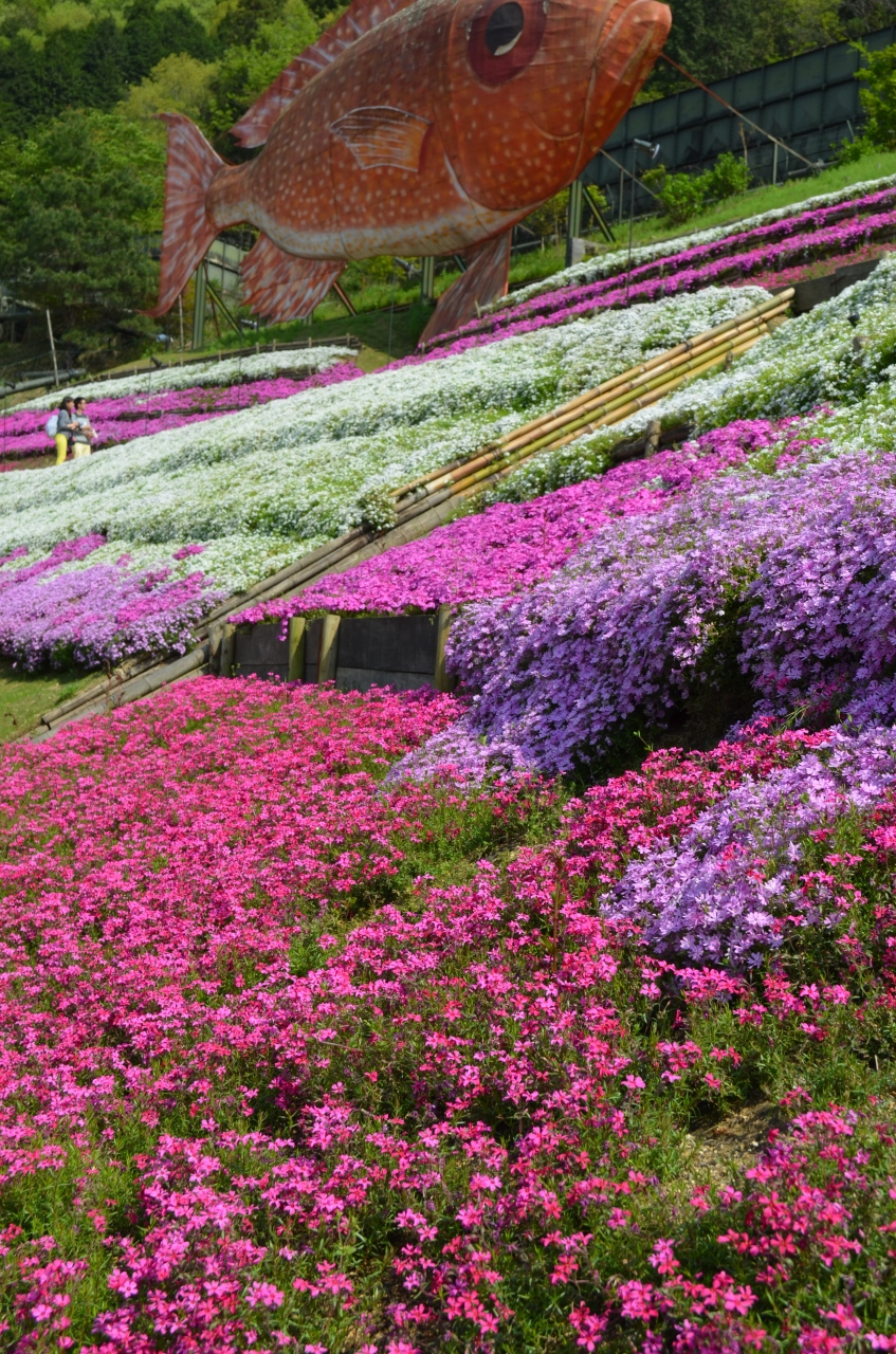 4月の終わりごろになると夢前川沿いにヤマサ蒲鉾工場の敷地内の丘陵地帯に芝桜が一気に咲きだす。土、日は多くの家族連れでにぎあう。入場料も要らず、週末にはいろんな催し物も開かれる。山裾に沿い奥に進むと一面の芝桜のオンパレードはすばらしい。
