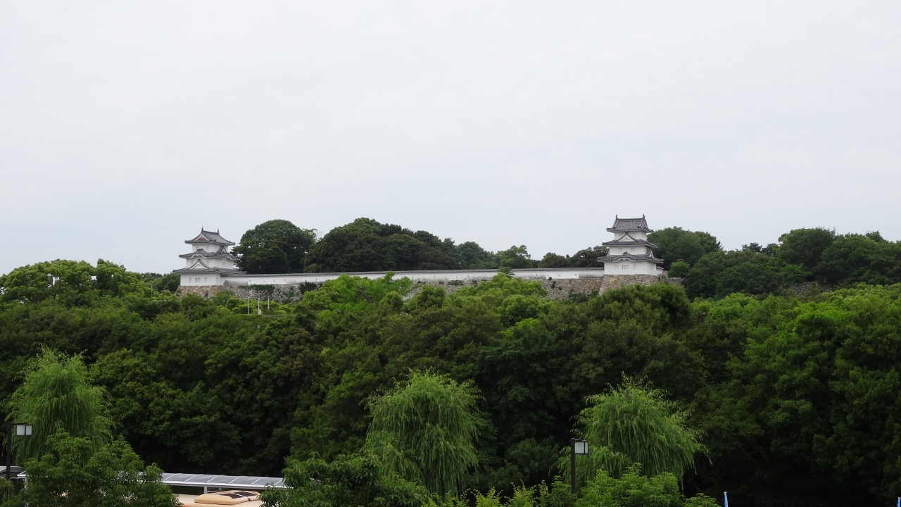 駅のプラットフォームから2つの櫓とそれを繋ぐ土塀がきれいに見えます。