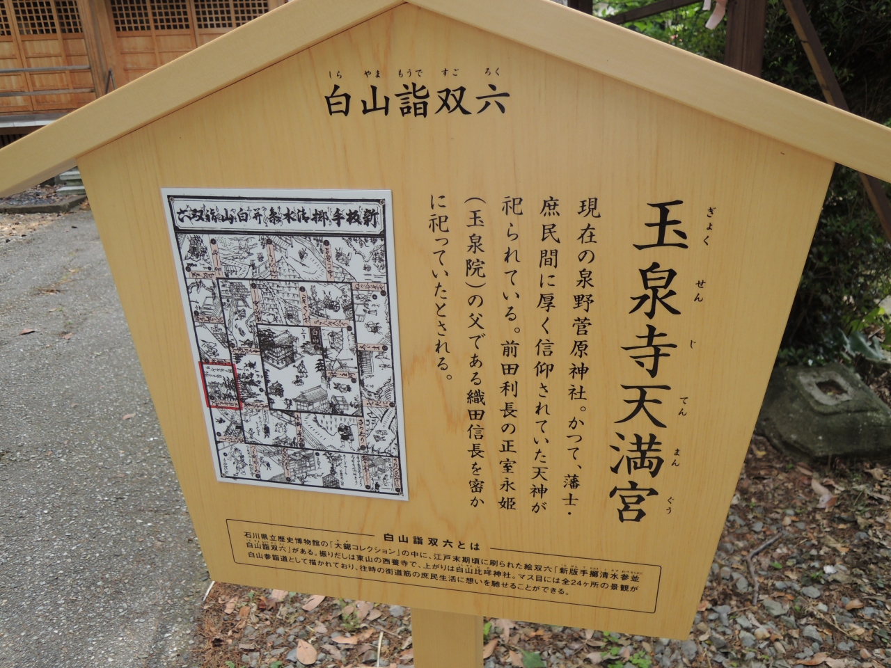 玉泉寺は泉野菅原神社の真横にありまして神社と同じ境内にお寺があるという不思議なところでした。織田信長の五女・玉泉院が、三代利常に請うて玉泉院を創建したそうです。
