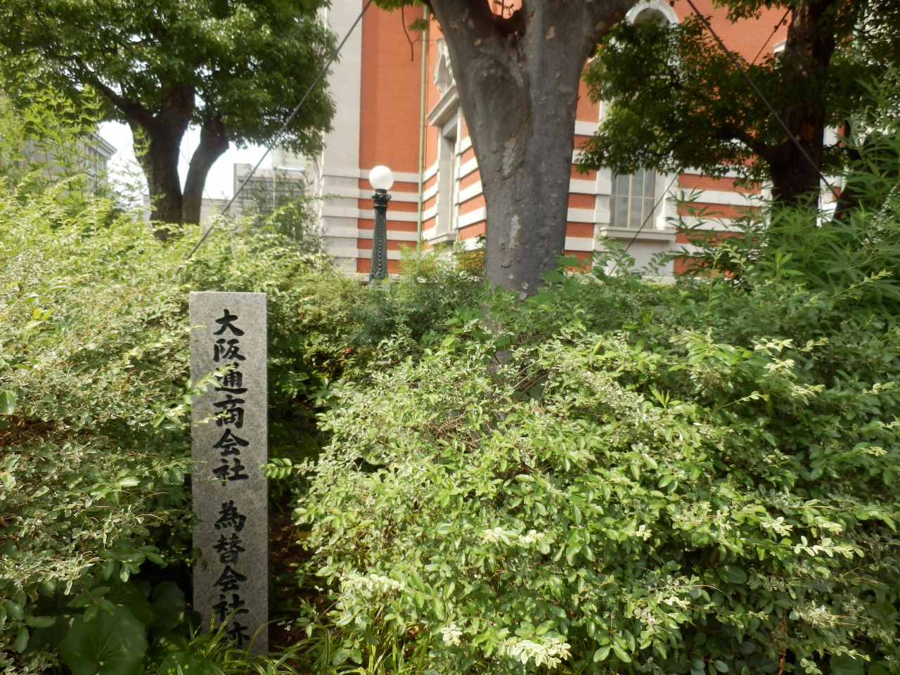 大阪ノビジネス街である中之島、御堂筋を挟んで西側の中之島、土佐堀川の上流に向かって大阪市役所、府立中之島図書館、市立中央公会堂と続く、図書館と公会堂は国の需要文化財指定、公会堂の南東角の緑地にこの碑がありました、明治2年為替商を出資者として設立された初めての株式会社で貸付や為替引き受け業務を行った、制度がなじまずに7年に解散しかしこの組織を通じて旧国立銀行の設立の礎となったとされている