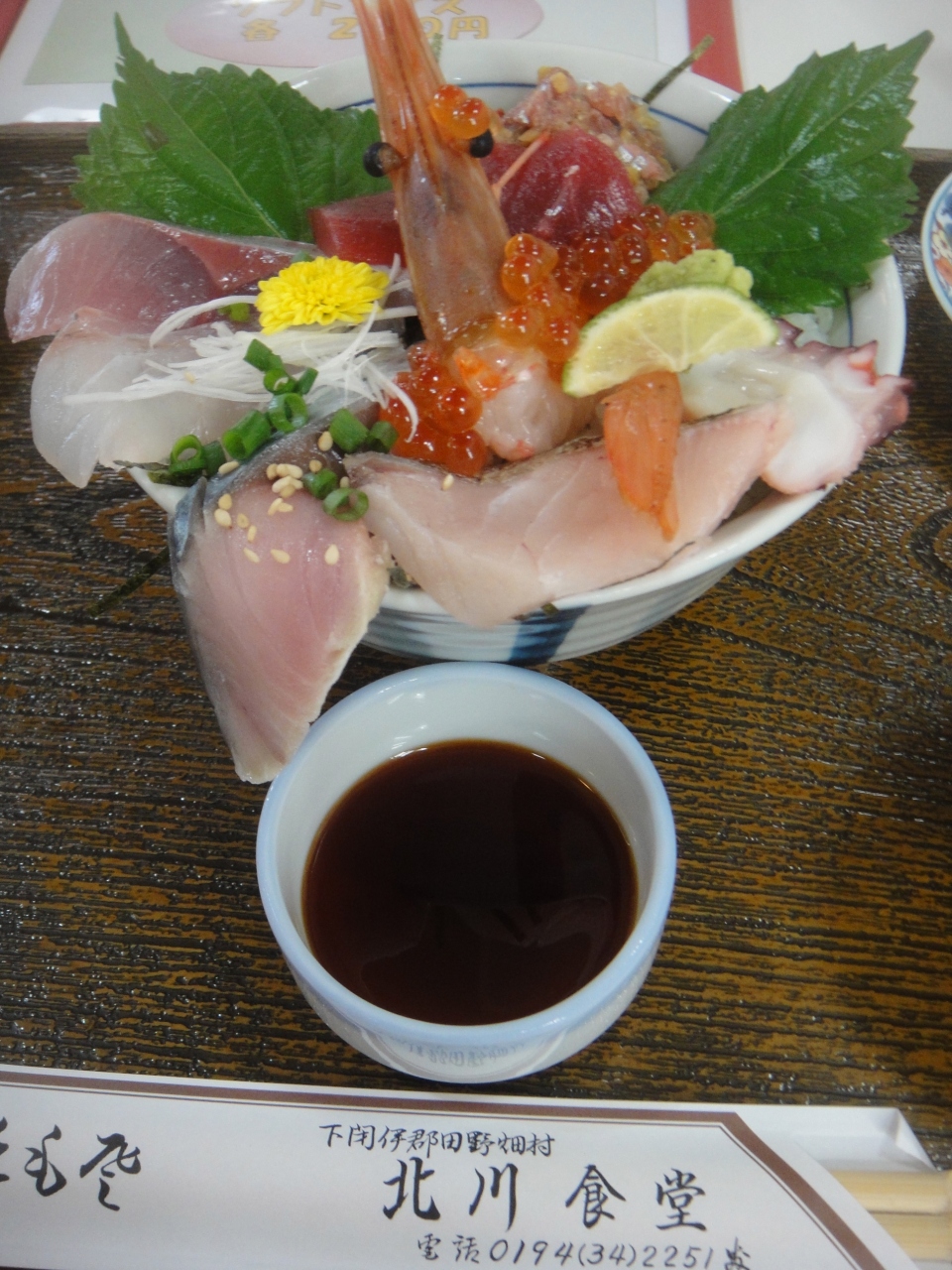 田野畑村の国道45号線沿いにある北川食堂、テレビで紹介されたこともある海鮮が美味しいお店です。日替わり丼はその日の具材が入口に書かれているので確認してから注文できます。多くの海鮮が入っても値段は思ったより安く、地元でとれるからを実感できるお店です。
