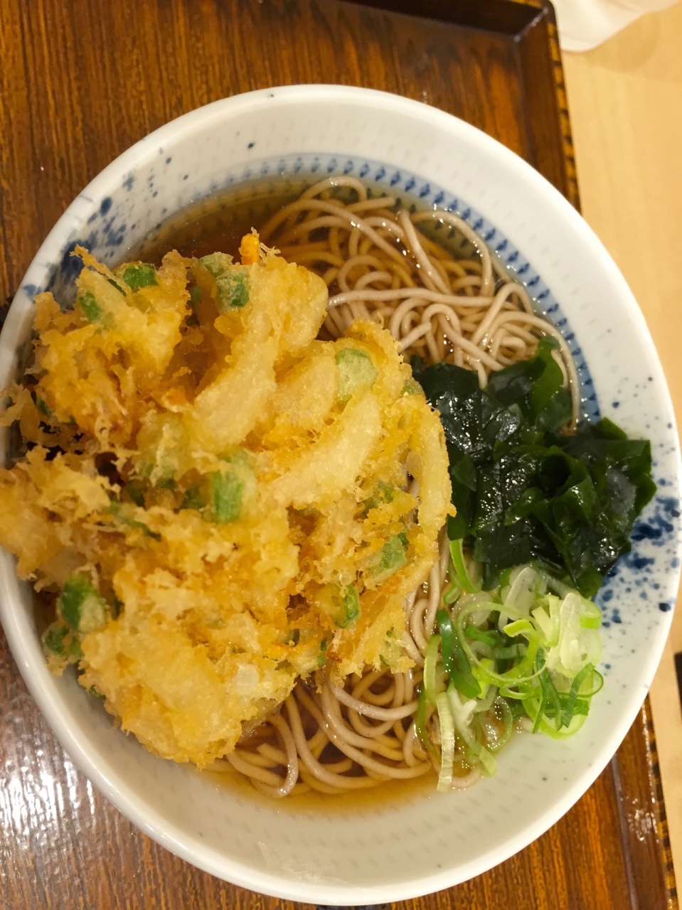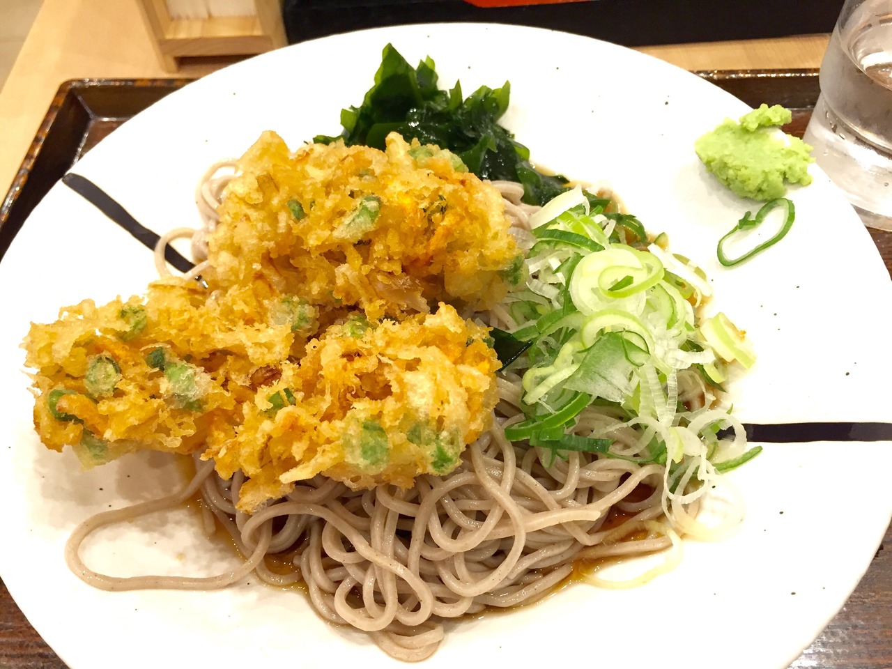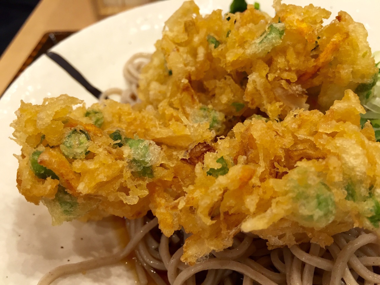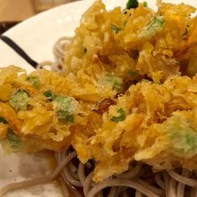 玉ねぎ、いんげん、にんじんのかき揚げが美味しい冷やしかき揚げそばでした。