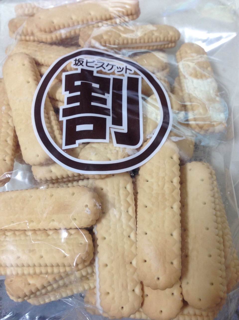 工場直売所で、正規品の他にも大袋に割れたビスケットを詰めたものなども販売しています。