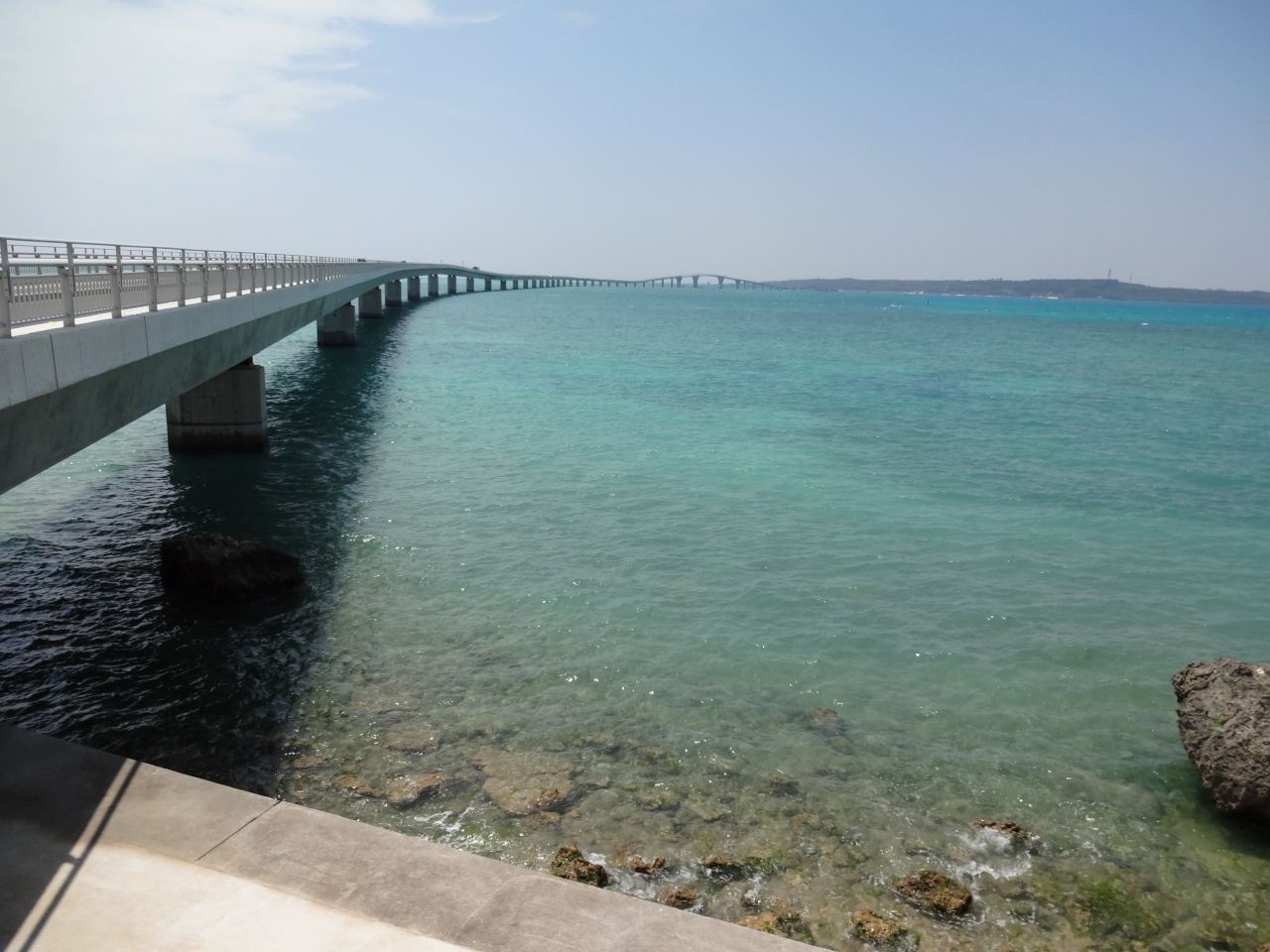 - エメラルドグリーンの海の中カーブを描きながら伸びる大橋は見事。
