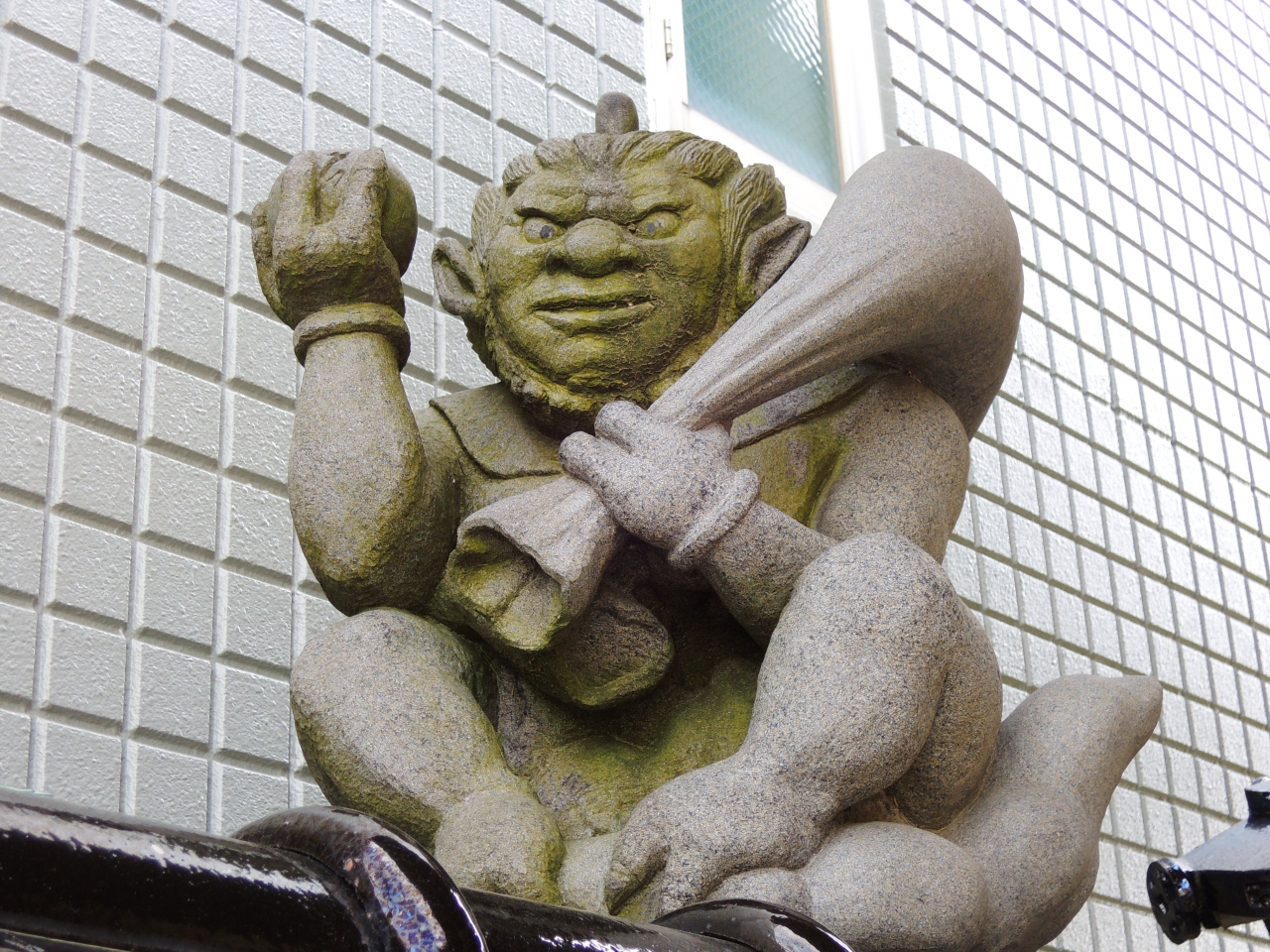 成学寺の門前の塀の上にはなんと石で作られた風神雷神があり、そのユニークさにとてもほほえましく思えました。看板の説明文を読むと本堂の内部には木造の風神雷神像があるということでした。