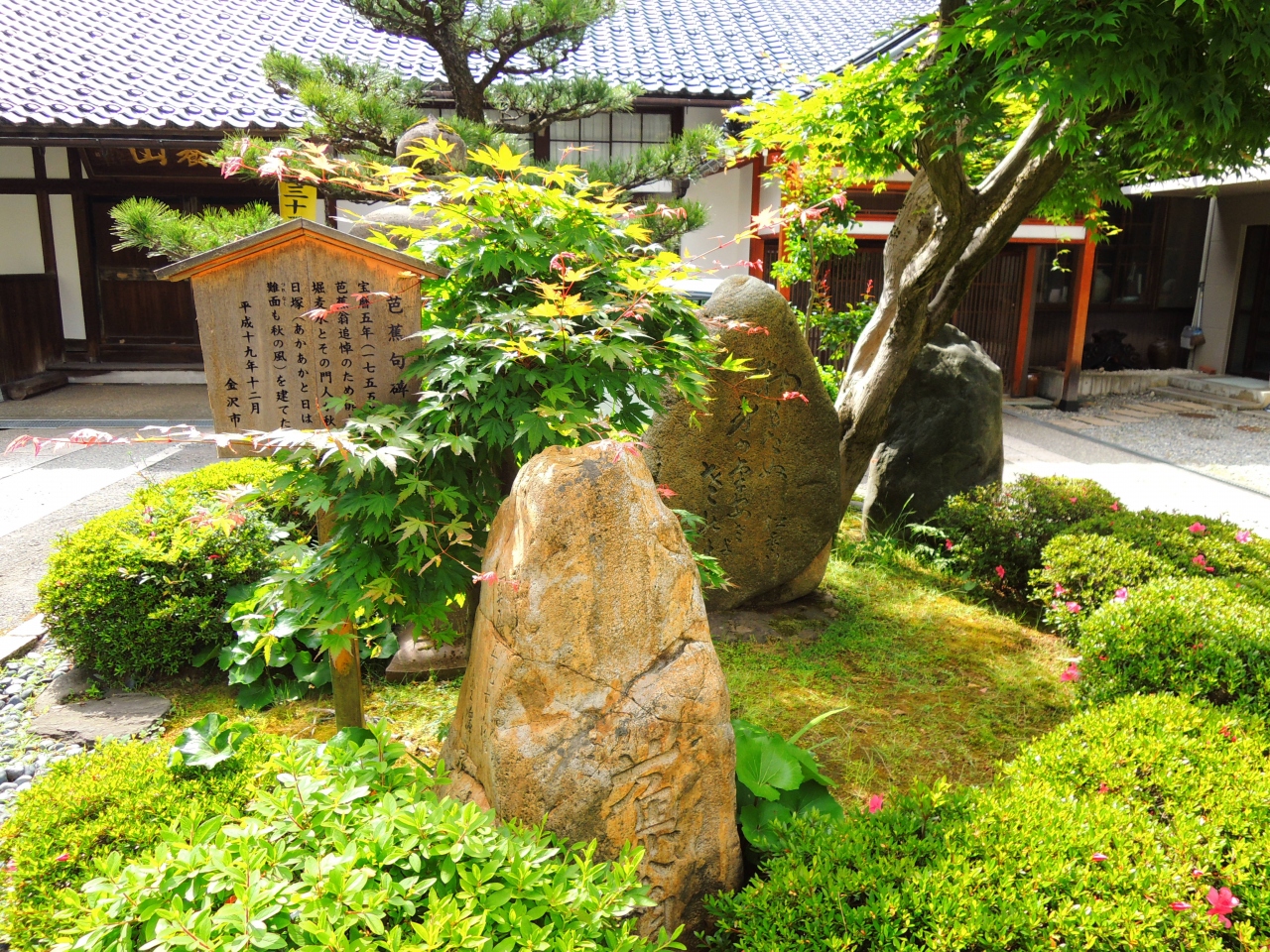 成学寺の境内にある松尾芭蕉の句碑は芭蕉の門人たちが建てたものだといいます。門くぐると正面にありとても目立ちます。この成学寺の門には塀の上に風神雷神像がありそのユーモアがとてもいいものがあります。本堂内には木造の風神雷神像があるそうですよ。