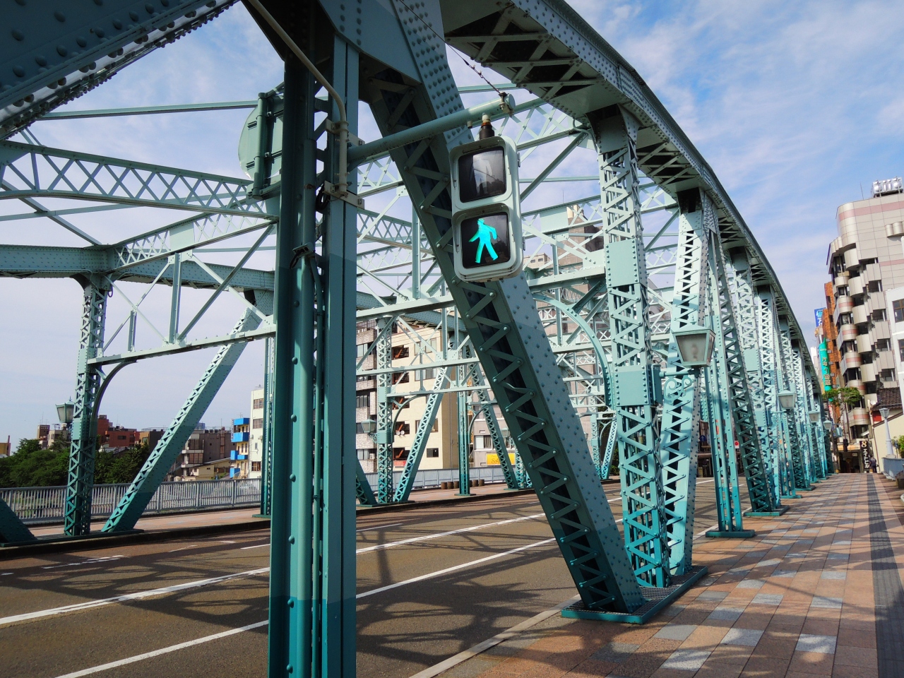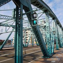 犀川大橋は遠くから見ると古い昭和の鉄橋としか見えないものですが、近づいてみると意外や意外でとてもキレイな橋です。形は昔のものですが塗装もキレイで電燈もアンティークな感じになっています。橋の途中にはベンチもあったりして散歩にもいいところです。