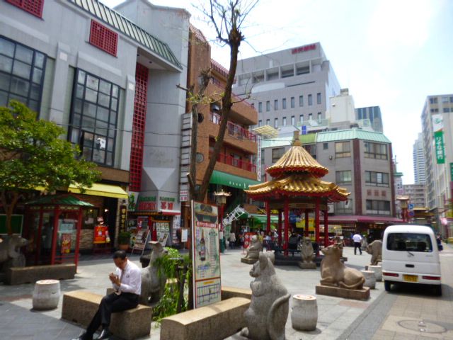 南京町のちょうど真ん中に位置している広場で、中央に象徴的な建物があり10人も座れない位のベンチになっています。周りにも動物の彫刻や少し座れるような所もあります。南京町は基本食べ歩きを楽しむので、この広場で食べて休憩している姿をよく見ます。