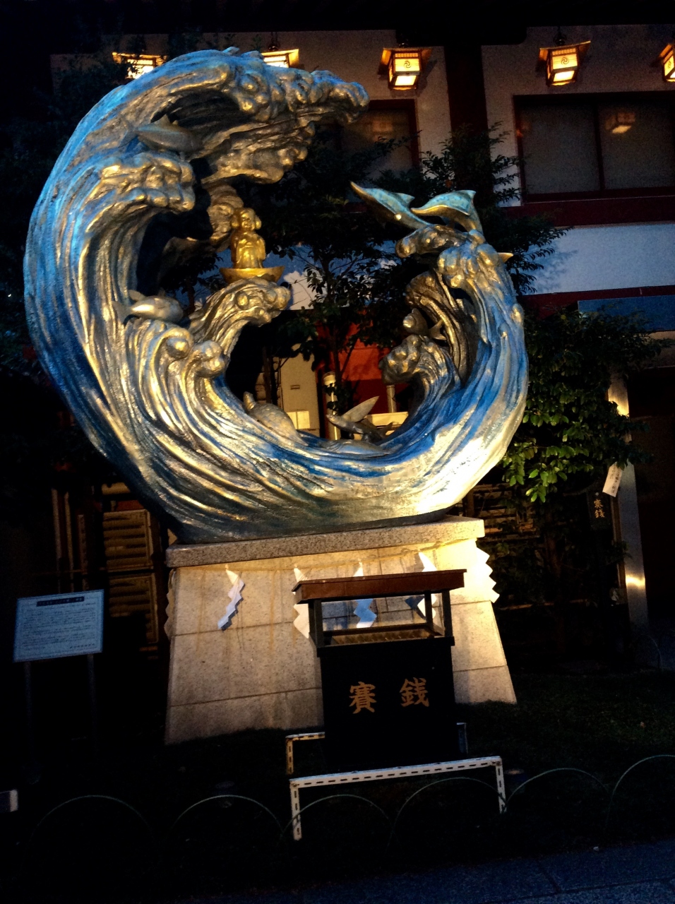 神田神社の鳳凰殿の隣に東京芸術大学学長の宮田亮平教授によって建てられたものです。えびす様は正式名は少彦名命で、海の彼方にある常世から海豚、鯛、トビウオといった海の仲間に守られ、大海原を渡り来訪された小さな神様らしいです。