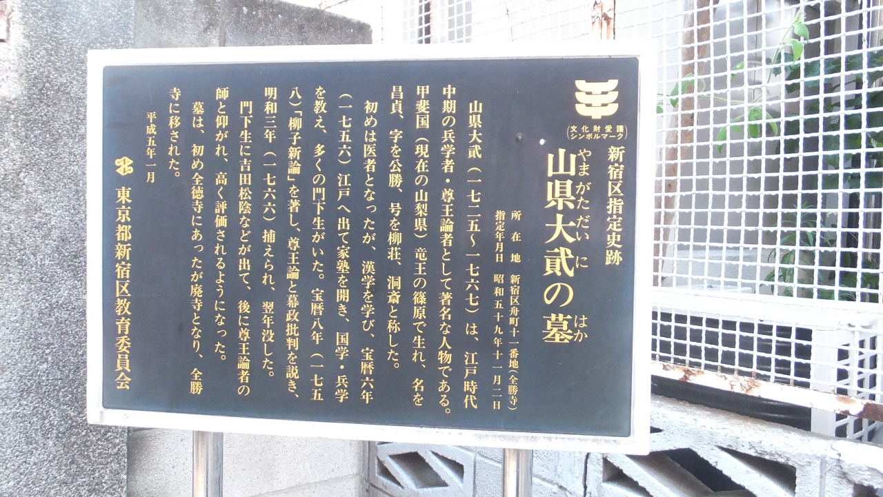 「山県大弐」という、江戸時代に活躍した思想家で、また天文学や医学にも精通した江戸時代中ごろを代表する大学者の墓があります。