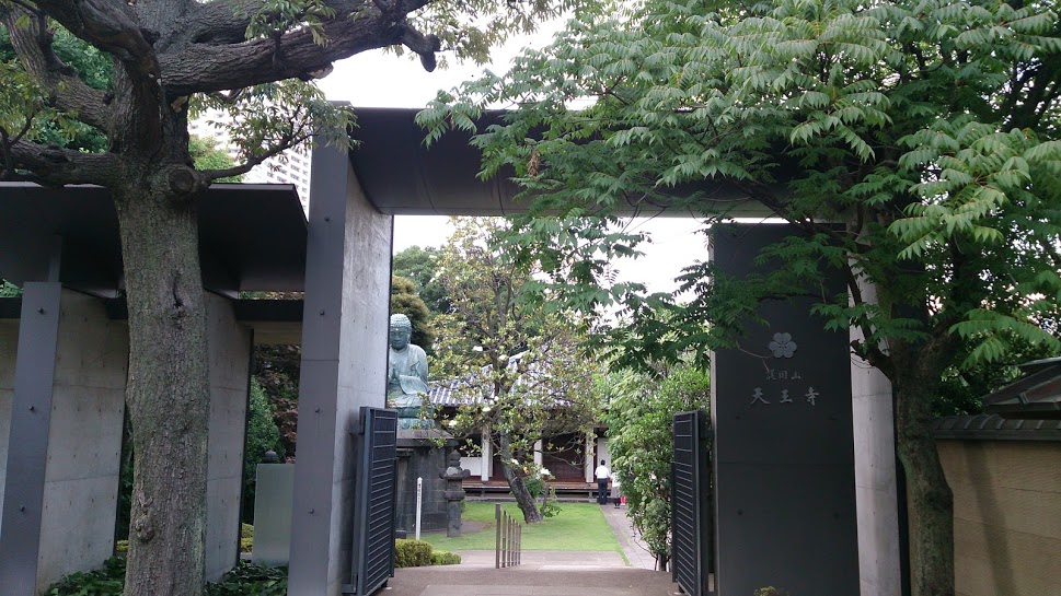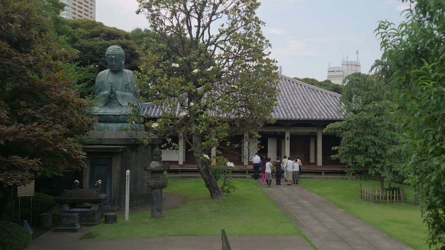 ここまで現代的な山門は、さすが大都会 東京の寺院といったところで、ここまでおしゃれな山門は多数の寺院がある東京でも非常に珍しいと思いますし、一見の価値ありです。境内も本堂は標準的な仏式の建物ですが、広い境内は芝生が敷き詰められており、木々も綺麗に管理されており、広く太陽光線を浴びることが出来るような形で木々も配されており、気持ち良い空間が広がっています。また、境内の一画にある大仏は青銅の素材が陽の光に照らせ青光りしており、その大きな体とあわせて圧倒的な存在感です。平日の午後でしたが梅雨の中休みで天気も良かったせいか、参拝者もちらほら居ました。