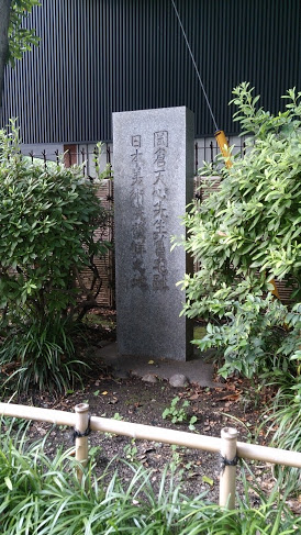 住宅街にある、小さな公園で児童公園のような場所で、その一画に記念碑や六角堂があって、初めて岡倉天心の記念公園であることが分かる感じの地味な公園です。日暮里・谷中界隈を散策する際の休憩には丁度良い感じの公園です。六角堂の内部には、岡倉天心の金色の胸像が置かれており、施錠されているのでガラス越しに覗く感じになります。木々で直射日光が遮られていて、少し暗い六角堂ですが、内部は昼間でも蛍光灯が点灯し明るくなっている分、胸像が金色だけに何だか凄い感じの存在感になっています。