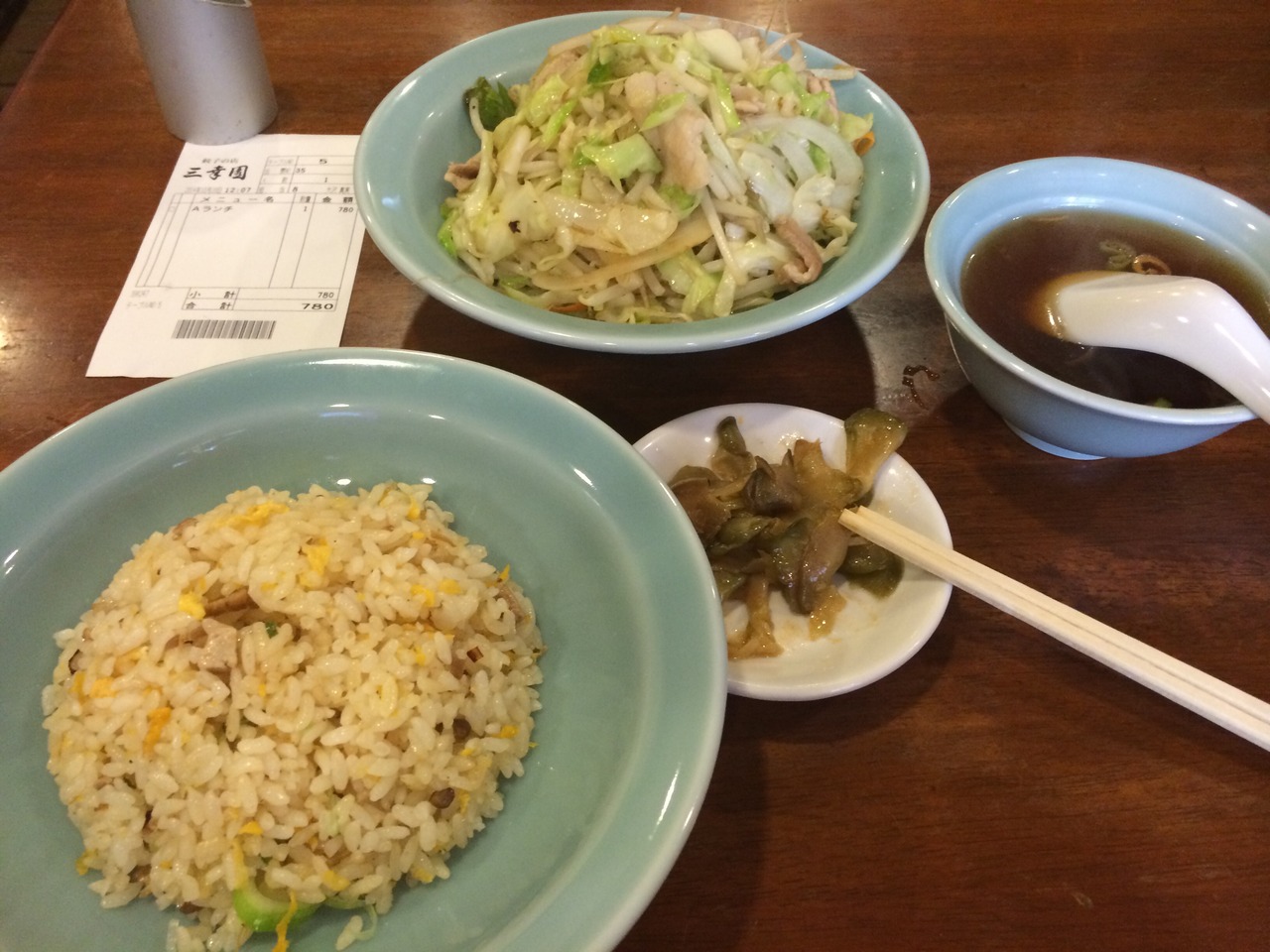 店内は活気がありカウンターとテーブル席がありテーブル席ならも炒め品の音と匂いが届きます。餃子が有名な店ですが店外の日替わりメニューに記載があったランチメニュー 半チャーハンとモヤシ炒めを食べました。味は普通でした…