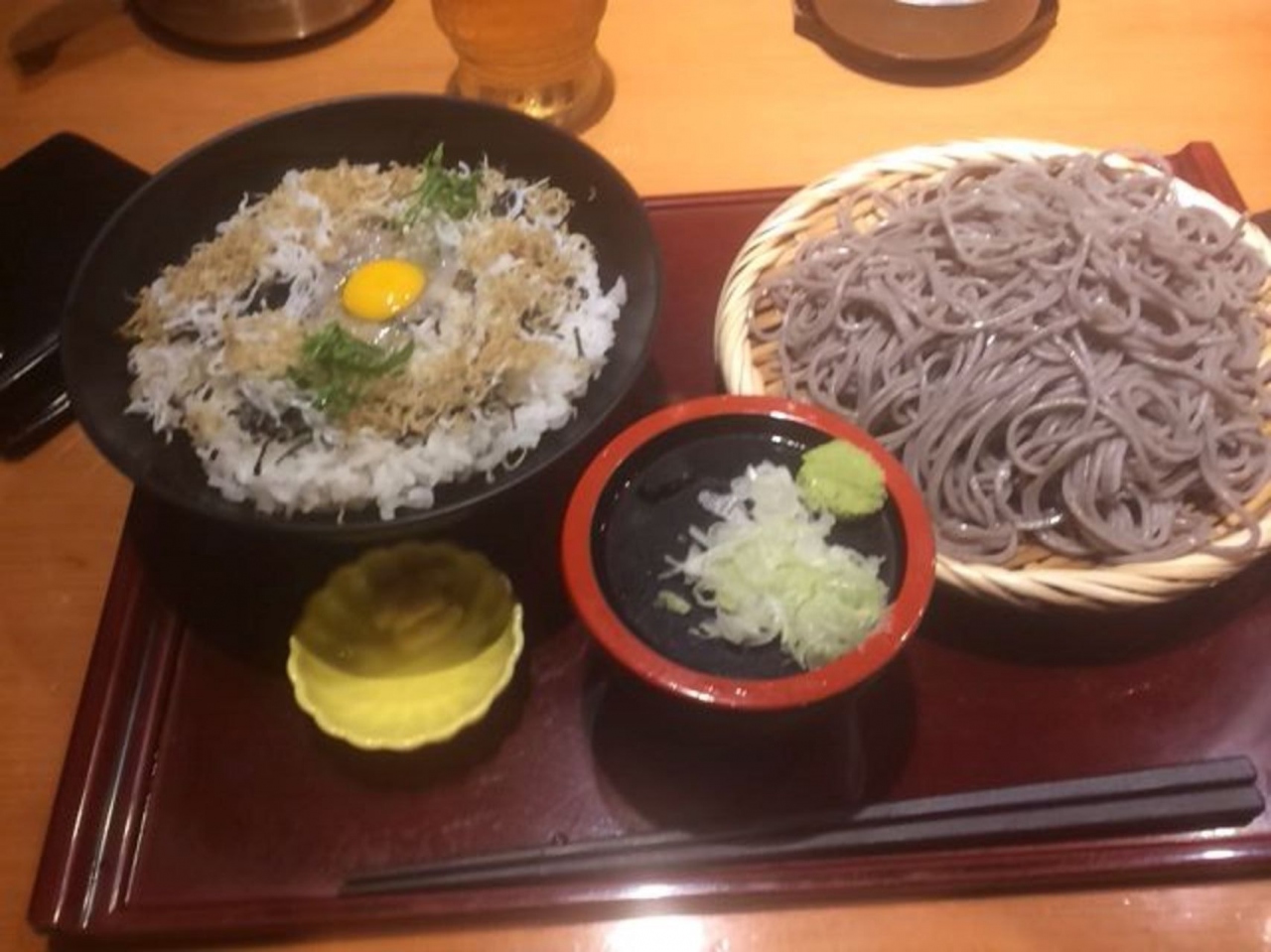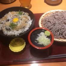 三色しらす丼とごまそばのセットで890円でした。立地柄高めの値段設定だと思います。ごまそばは、ごまの香りも豊かで美味しいです。歯ごたえも良いし、しらす丼も生しらすが乗ってて得した気分です。カウンター席があるので一人でも入りやすいく、女性一人客もいました。水と蕎麦湯が席に置いてあるのでいちいち店員さん呼ばなくてよいのが有り難いです!